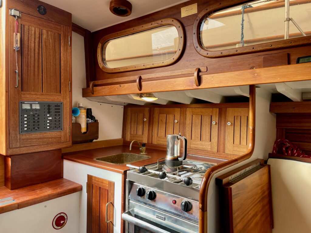 My plan turned out to be somewhat overly optimistic. We spent the next ten years rebuilding her from the keel up. Some of the work included: all new floors and 52 pairs of steam-bent white oak frames, complete refastening of the mahogany hull planking with some 5,000 new bronze screws, new covering boards, toe rails, transom, deck hatches, companionway, cockpit sole, etc, a new engine and complete plumbing and electrical systems. The sitka spruce mast, boom and spinnaker pole were restored, we installed new fir spreaders and hardware, and all the standing and running rigging was renewed. In the process we removed and rebuilt the interior including all of the upholstery, and most of the cabinetry, and we replaced the propane galley stove and furnace.