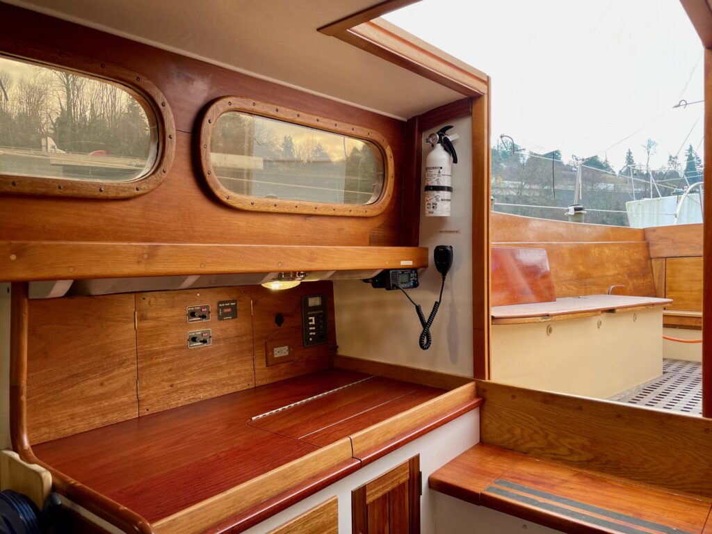 RICOCHET is a Kettenburg PCC and she is for sale: $88,000. The PCCs were designed by George Kettenburg in 1946 and built over several years by Kettenburg Boat Works of San Diego. The PCCs were very competitive, some say dominant, in west-coast and Transpac racing throughout the fifties and sixties. RICOCHET was first launched in 1956. She is hull number 21 of 24 PCCs built.We purchased a rather tired and neglected RICOCHET in 2008. Following a quick five-gallon restoration we happily cruised and raced her for a couple years. We were thrilled to win the coveted Spruce Cup, racing at the 2011 Vancouver Wooden Boat Festival. However, in November that year she sank at anchor.