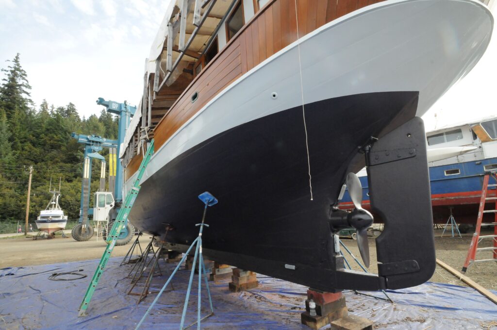 The work rebuilding Gipsy was extensive. All the spars and rigging were removed, spars were stored in a covered area. Wheelhouse and trunk cabin were measured, removed and disposed of. All interior bulkheads, tanks, wiring, plumbing and cabin sole were removed. Only the 7 ton Alpha Diesel remained. Gipsy was towed to a yard and hauled out. Over the next three months, all compromised wood we could find was removed. Some of the double sawed frames were repaired and single frames were sistered. Most frame damage was due to nails. The transom was reframed and approximately 35 planks were replaced. all the covering boards were replaced. The hull was re-caulked.