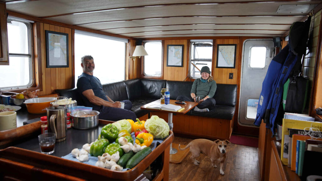 • The Endeavour in Icy Bay with Mt St Elias in the background