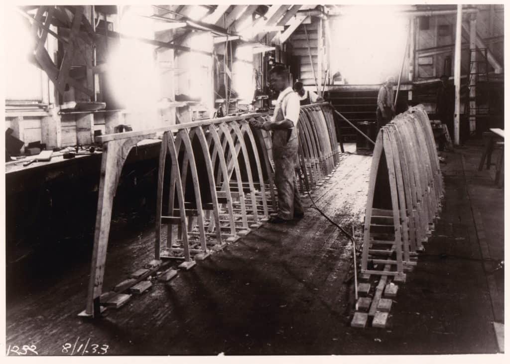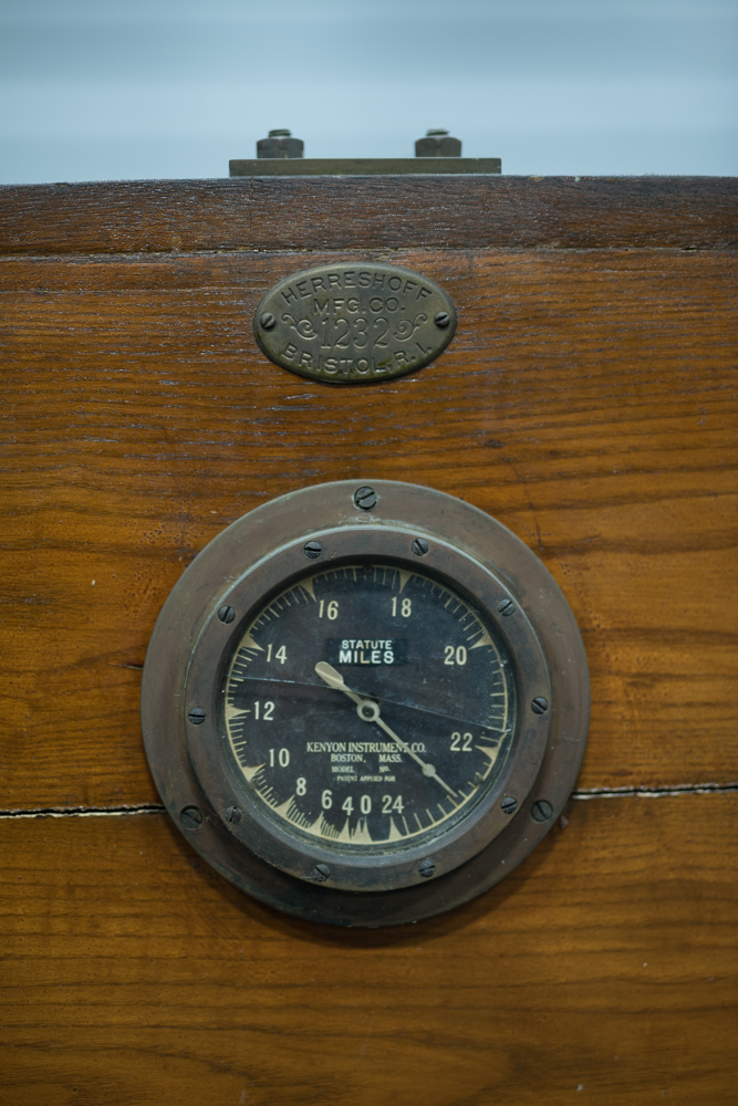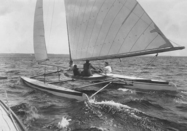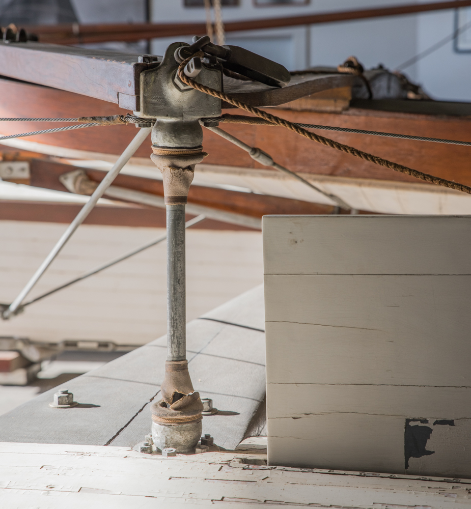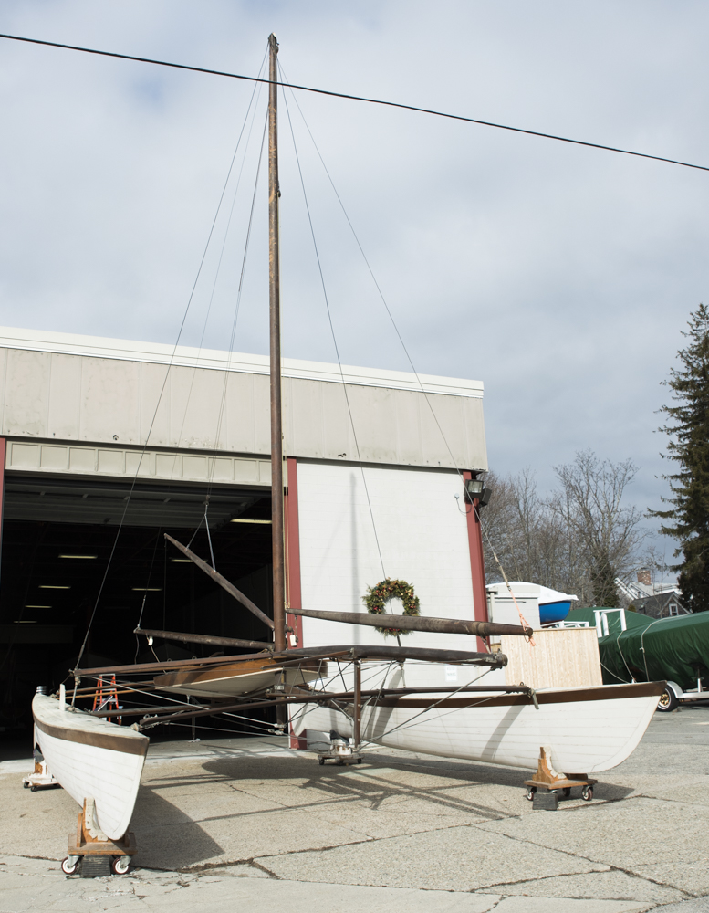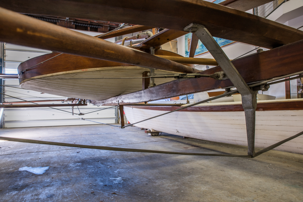 AMARYLLIS II (HMCo. #1232) was built in 1933 at HMCo. for K.T. Keller of Chrysler. It is a replica of a catamaran that Captain Nat designed and built in 1876. In June of 1876, the local paper reported the following: ” ‘Amryllis’ [sic] is the name of the strange little craft that has lately attracted so much curiosity in our bay, both by her great speed and unique appearance. She is a double boat, having one placed thirteen feet from the other, both being twenty-five feet long and twenty inches wide, drawing twenty inches of water. A platform supported between the two boats is capable of accommodating eight or ten persons. The chief novelty consists in a certain device giving freedom of motion to each boat, great speed, and the lively sensation of an ordinary yacht without her careening propensity. She is a perfect lifeboat and her speed rivals the fleetest sailing vessels in going to windward, and is much greater with a beam wind. She was built by the Herreshoff Manufacturing Company, and in a few days will leave here for New York, to enter the centennial regatta there, in command of her inventor and owner, Mr. N. G. Herreshoff, which port under favorable circumstances he thinks he can reach within daylight.” The original AMARYLLIS did indeed prove a speedy vessel, and her inevitable win at that regatta was famously contested. AMARYLLIS II was built by HMCo. workmen nearly 60 years later aided somewhat by N.G.H.’s memories, though is diaries suggest he found the final AMARYLLIS II to be overly heavy for his liking. This vessel spent many years on display at the Henry Ford Museum before returning to HMM for permanent display. Today, it can be seen hanging overhead in the Hall of Boats in Bristol. Of particular interest to viewers may be the ball-joint construction connecting all structural members, the steering mechanism by which both rudders are controlled, and the strong resemblance to iceboats of the period.Already a member? Log in herePhotos