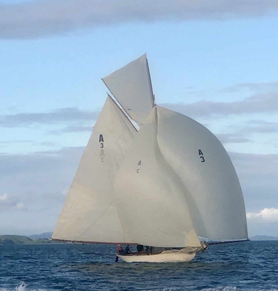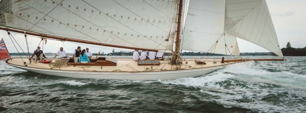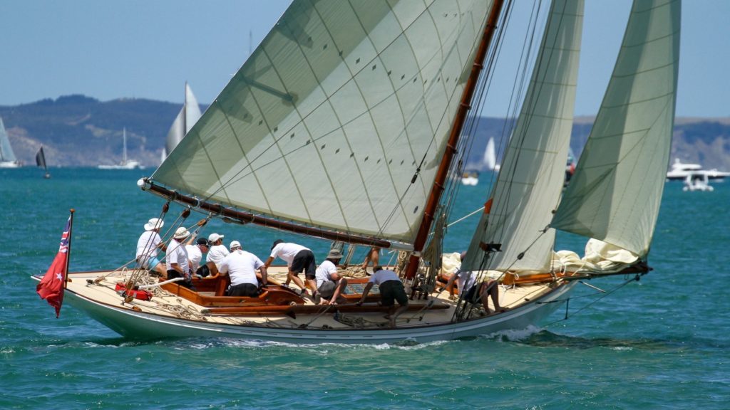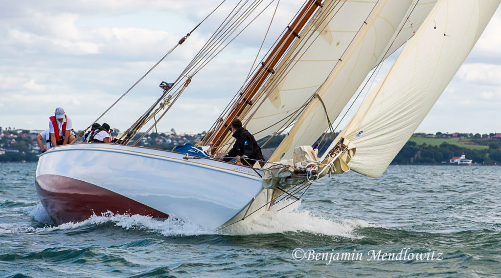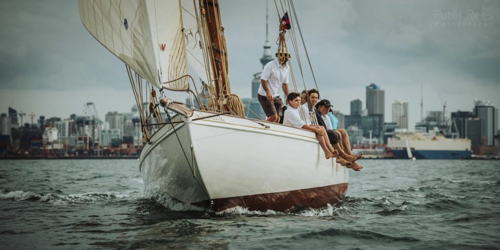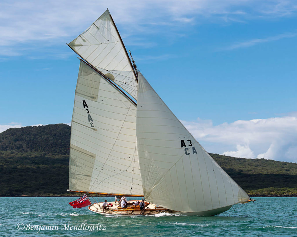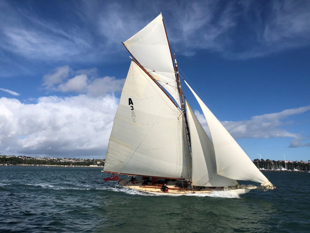 Ariki (meaning Chief or Leader in Maori) is arguably Arch Logan’s finest yacht and was the scratch yacht on the Waitemata from 1905-1938. Her design was a development of the Logan designed Rainbow of 1898 which in turn took her inspiration from the Royal Yacht Britannia.“One of Arch Logan’s lovely cutters, beautifully restored. A boat once seen, you’ll never forget—and if nearby you can easily see and appreciate her as she lies dockside near the Auckland Maritime Museum. Her flush deck makes for an exceptionally clean outward appearance disturbed only by an access companionway, a skylight, and the cockpit. Below, despite lack of standing headroom, the uncluttered symmetry still prevails in a marvelously open arrangement consisting of a pair of long, facing settee/berths and a tiny galley—all of it beautifully trimmed and finished.” – Maynard Bray