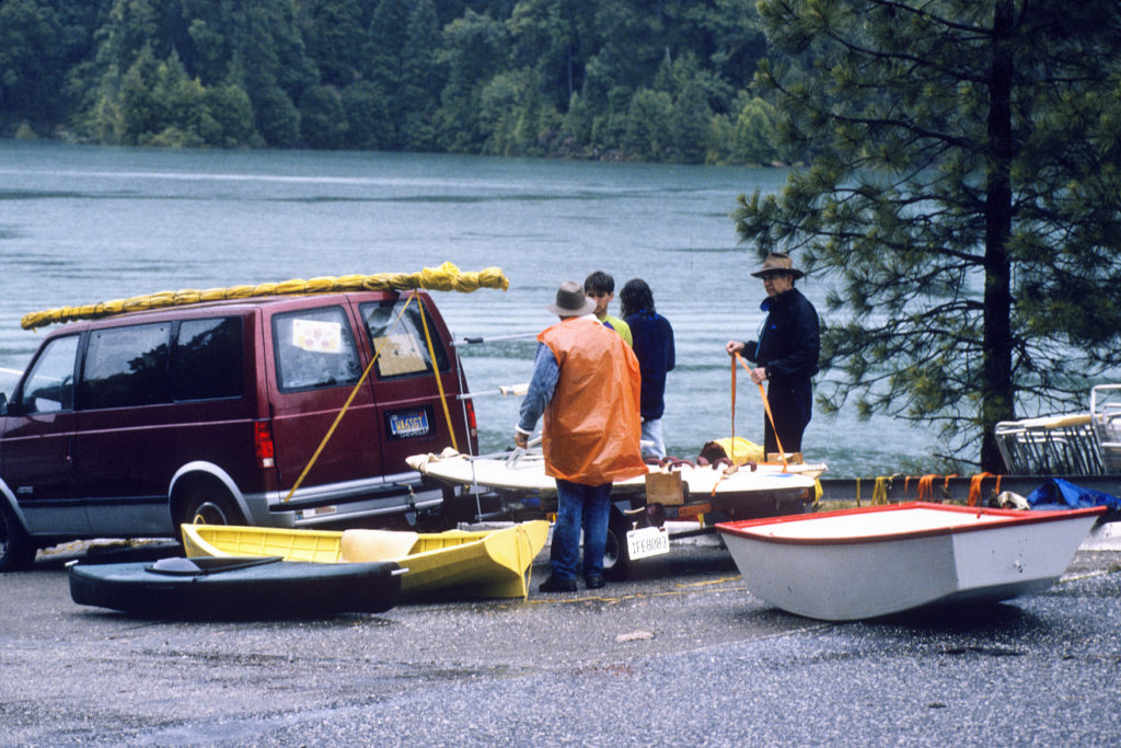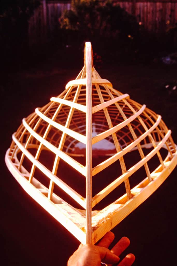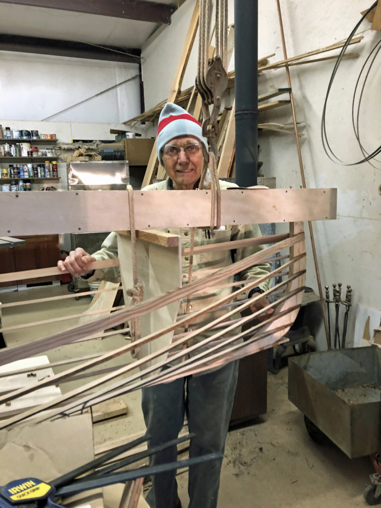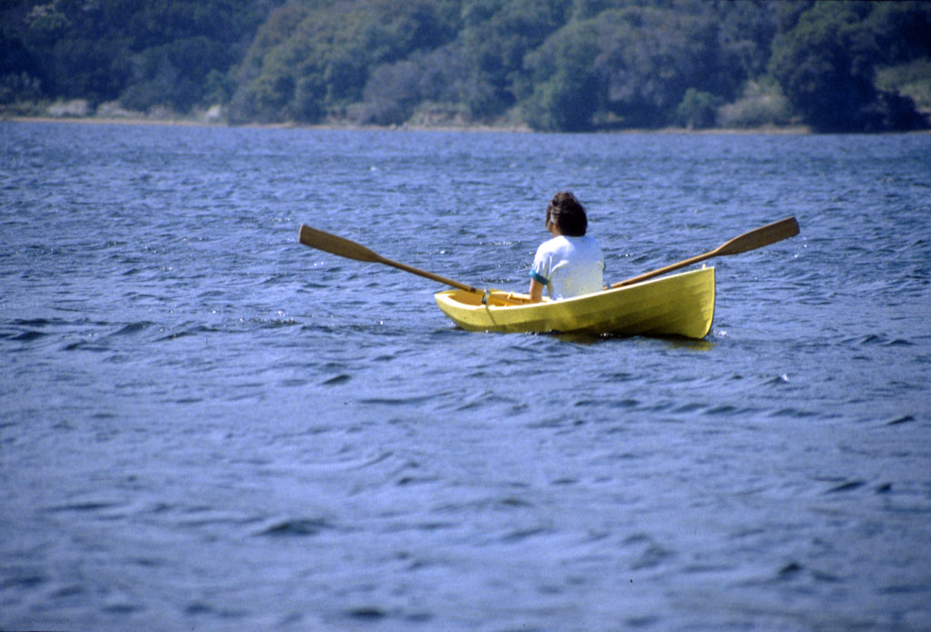 The original 18# “Banana Boat”, built in our garage of aircraft Spruce stringers over steam-bent Ash ribs covered with heat-shrink Dacron, was given away to a teen-aged friend in North Dakota when the Air Force sent me to Korea. Now retirement allows me to build a replacement with Douglas Fir stringers and wet, green, cold-bent oak ribs covered with heat-shrink Dacron. The wood grew and was milled on our property by the owner/builder, myself. Banana Boat II will also be painted with aircraft finish in bright yellow. It seems a little heavier that the original 18# boat but perhaps it is that I am about 30 years older! My wife and I can row together even though it is only 10″ amidship with a 16″ stem.Already a member? Log in herePhotos