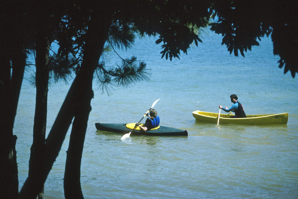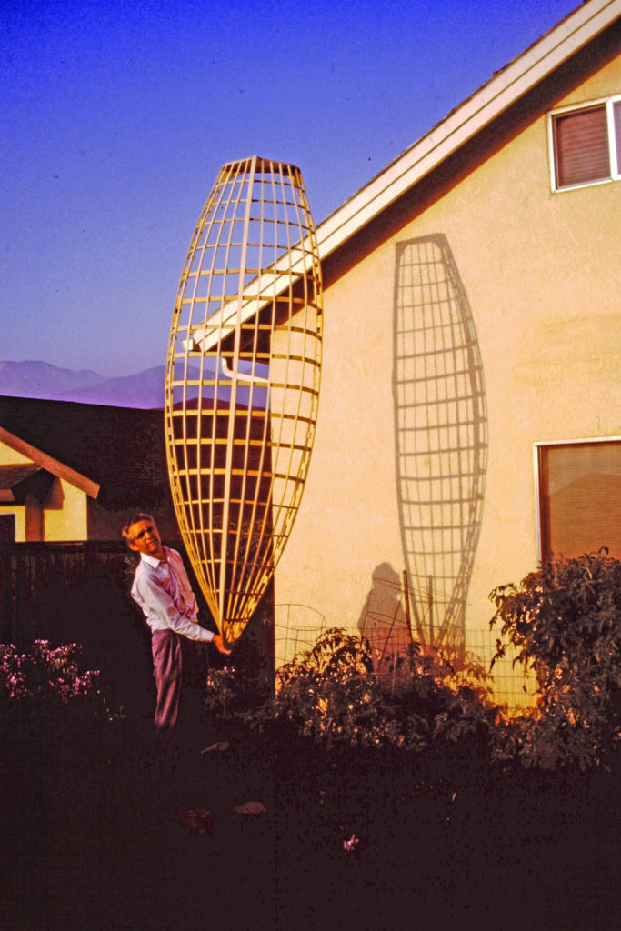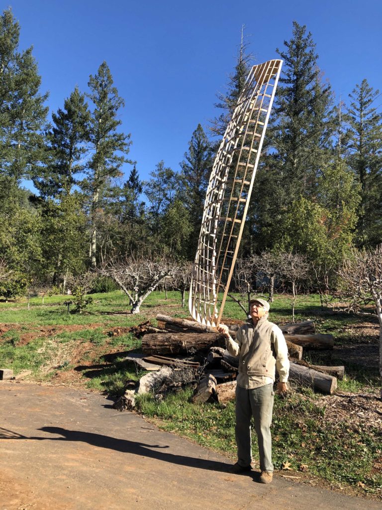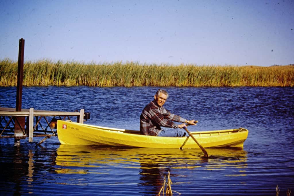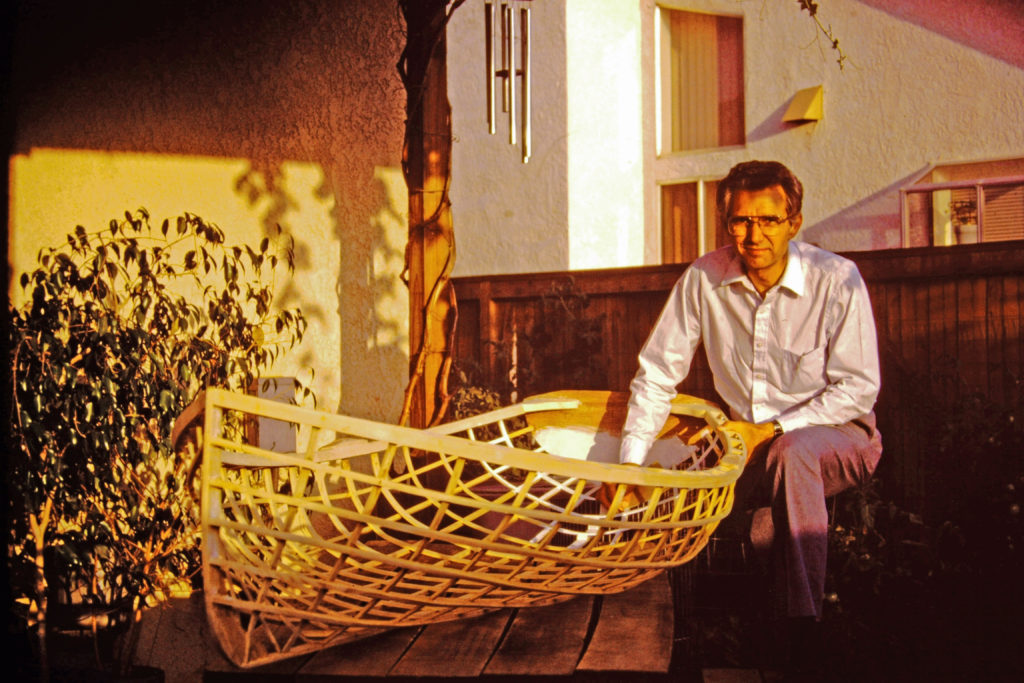 The original 18# “Banana Boat”, built in our garage of aircraft Spruce stringers over steam-bent Ash ribs covered with heat-shrink Dacron, was given away to a teen-aged friend in North Dakota when the Air Force sent me to Korea. Now retirement allows me to build a replacement with Douglas Fir stringers and wet, green, cold-bent oak ribs covered with heat-shrink Dacron. The wood grew and was milled on our property by the owner/builder, myself. Banana Boat II will also be painted with aircraft finish in bright yellow. It seems a little heavier that the original 18# boat but perhaps it is that I am about 30 years older! My wife and I can row together even though it is only 10″ amidship with a 16″ stem.Already a member? Log in herePhotos