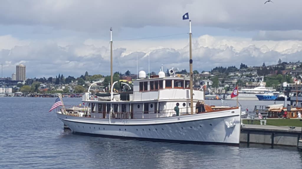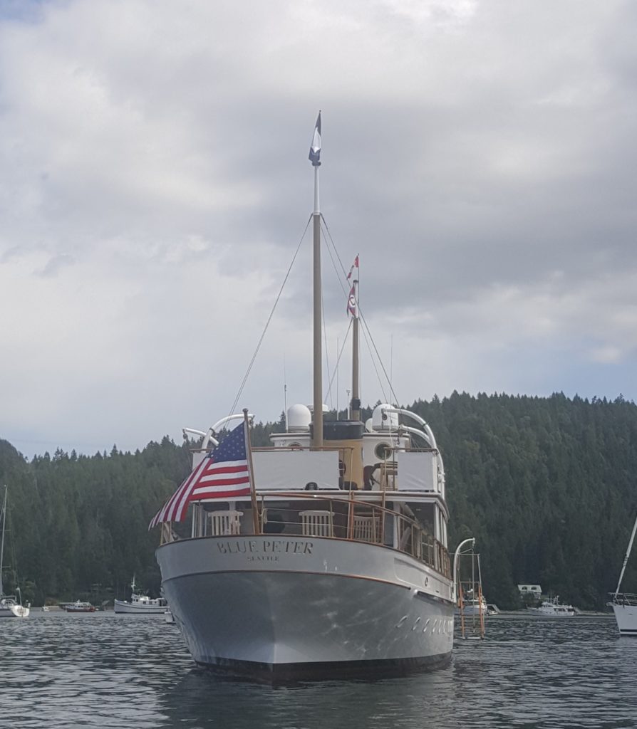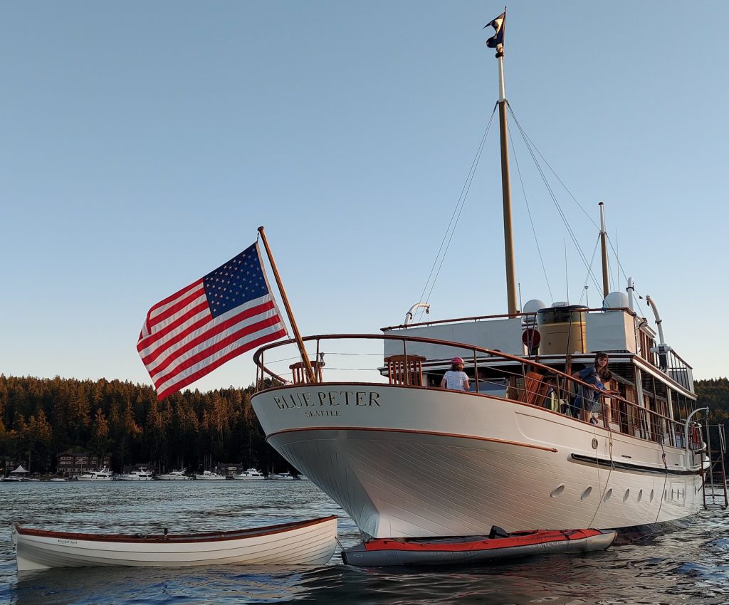 MV. Blue Peter is a classic, fan-tail motoryacht, Designed by Ted Geary and built at Lake Union Drydock & Machine Works in 1928. She has white topsides, and cabin houses, with extensive varnished teak trim, and bronze deck fittings. Accommodating up to 50 guests on day-trips, the yacht can sleep 8 overnight guests with two crew. She has a large, modern galley just forward of the dining salon, and has a generous wet bar on the aft-deck, complete with a propane BBQ grill. The yacht carries a 14 foot rowing/ sailing dingy, a two person kayak, and a 14 foot hard-bottom inflatable tender, with a 40 HP. motor.Already a member? Log in herePhotos