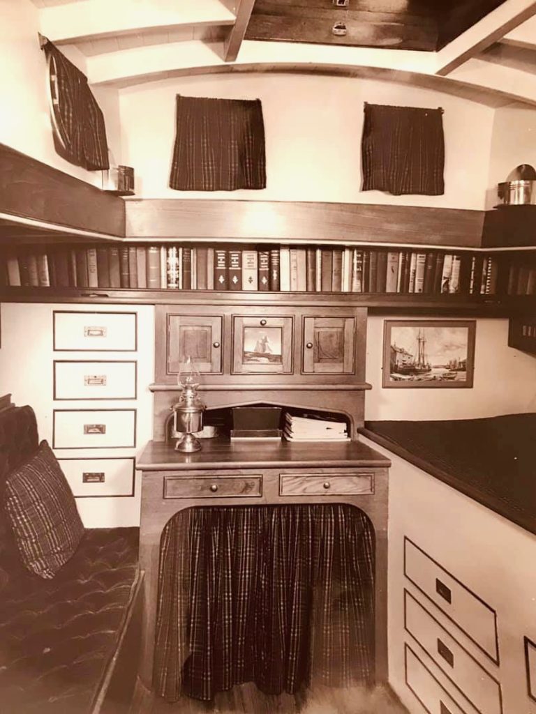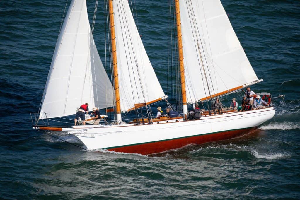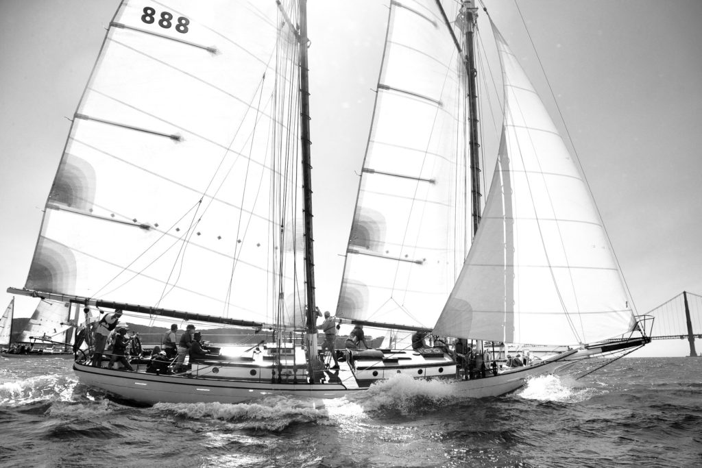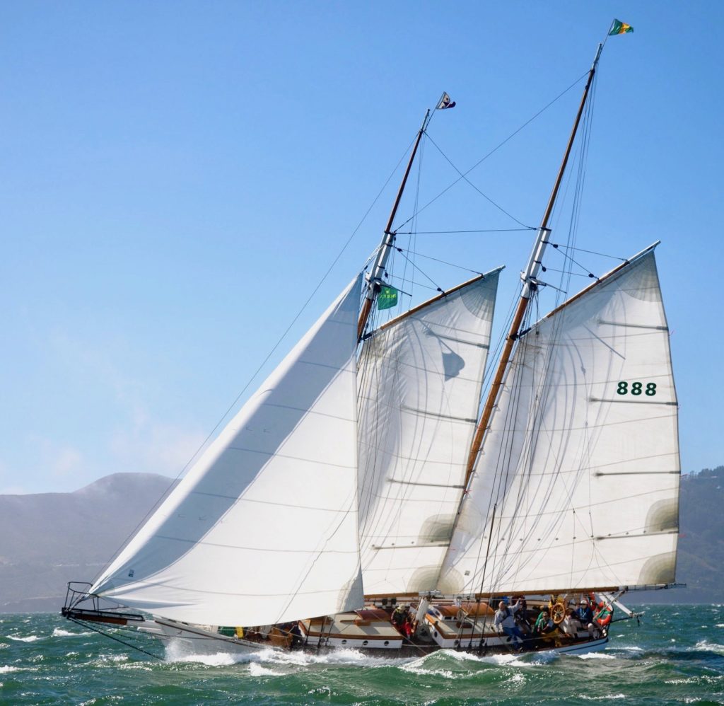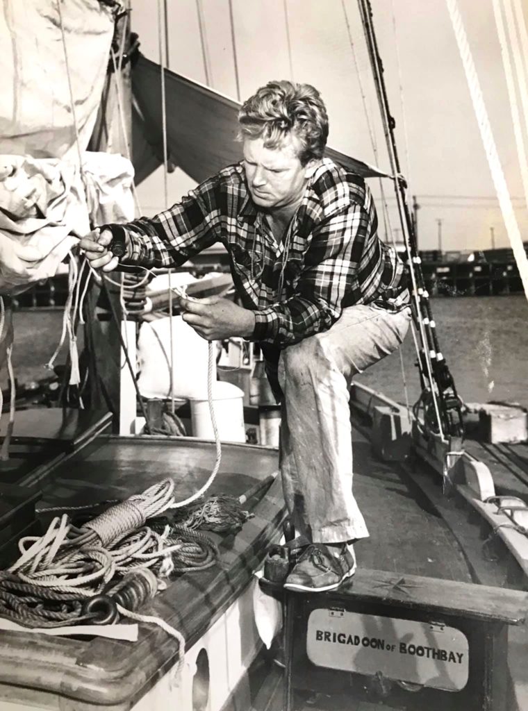First yacht design by L. Francis Herreshoff, in 1923 (Burgess, Swasey and Paine Design #257), and launched as “Joann” by Britt Brothers, Salem, MA in 1924 for Waldo Brown. Renamed “Brigadoon of Booth Bay” by Sterling Hayden who had her re-rigged as a “Coaster Schooner” and brought her to the US West Coast. In the 1970’s, a dark period in her life when she was owned by a rock group, Brigadoon of Booth Bay was slowly rotting in a canal in San Rafael, California. She was rescued and restored by Terry Klaus who renamed her simply “Brigadoon.”