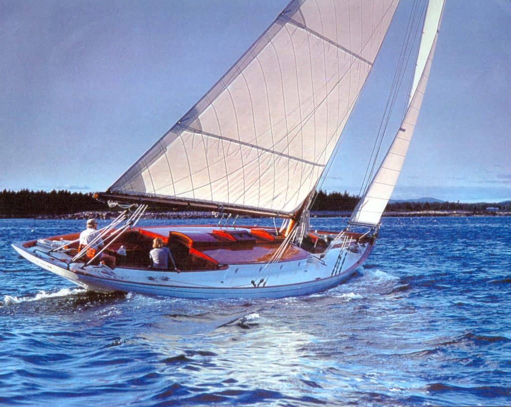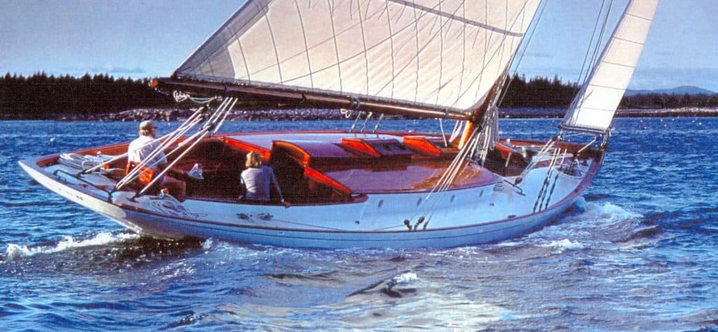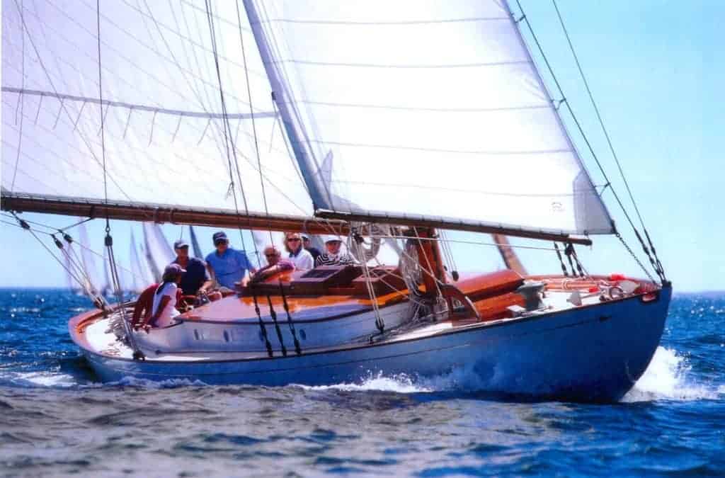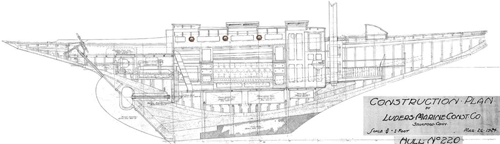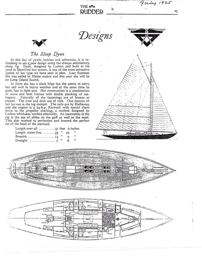 Dyon, a 52’ gaff rigged sloop, was co-designed by Luders and Philip L. Smith in 1924. She was built that year at the Luders Ship Yard in Stamford Connecticut, and described as “one of the most attractive yachts of her type we have seen in plan… in form she has a slack bilge but she seems to carry her sail well in heavy weather and at the same time be quite fast in light airs.”