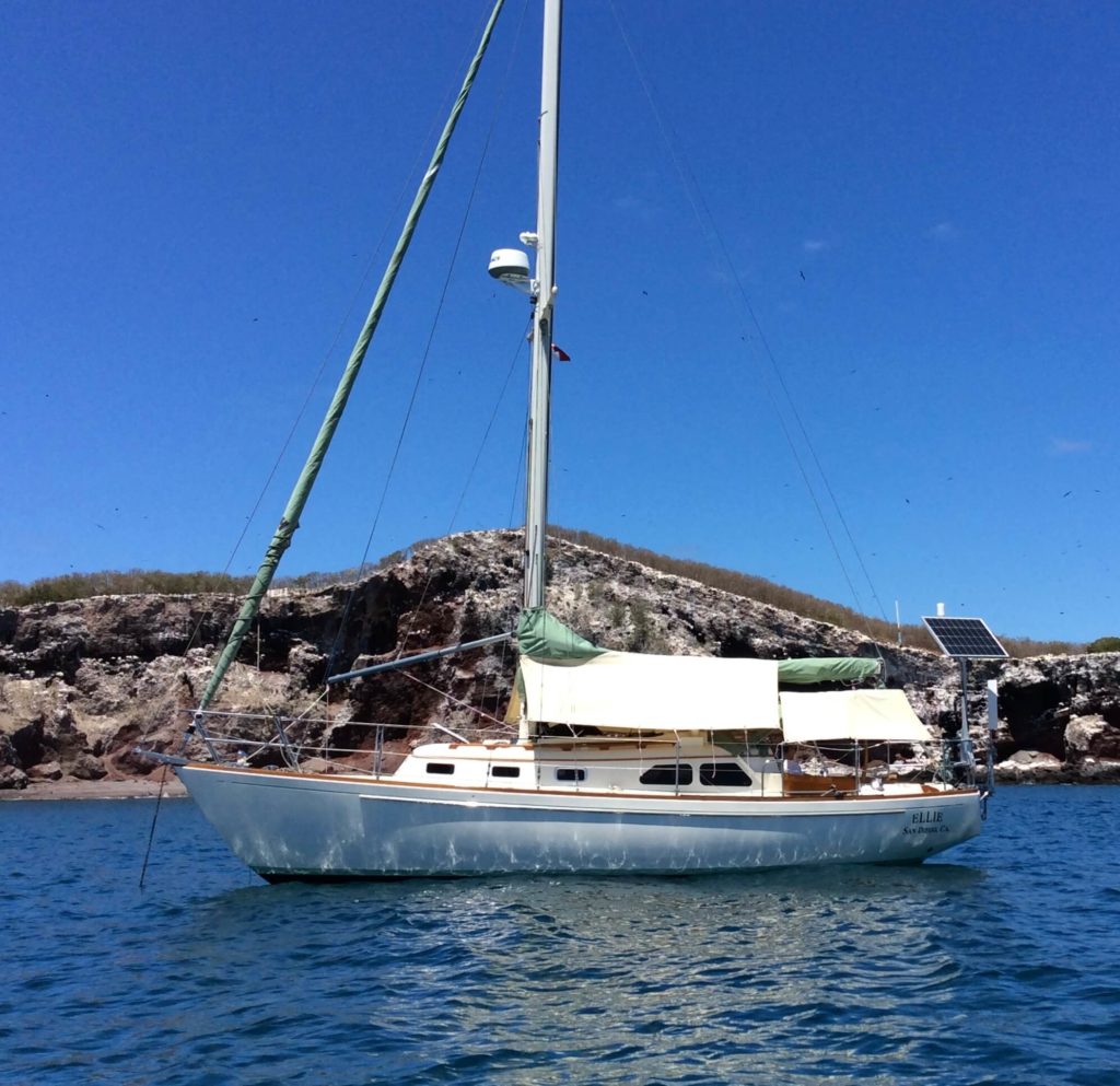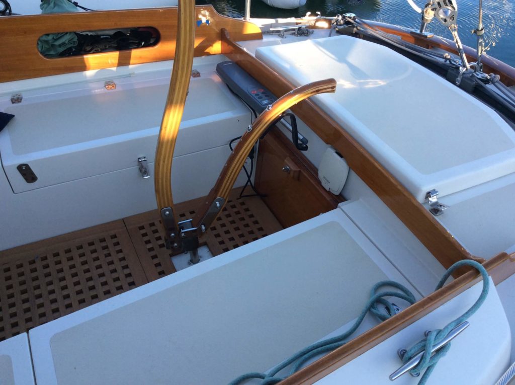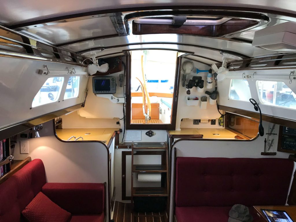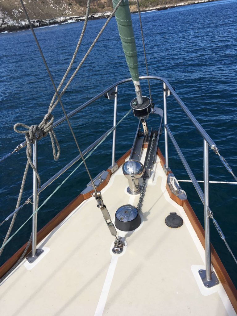 Ellie is essentially a new boat – virtually everything was replaced except the hull, deck, and mast extrusion. The interior layout remains fairly true to the original, though the Herreshoff interior brightens her up considerably, as does the addition of a hatch in the salon. The deck layout works well for sail handling and anchoring and she’s a very easy boat to singlehand. The photos show the reverse tiller which steers the boat under wind vane or autopilot. This really frees up the cockpit except when hand steering.Ellie’s owner and lifelong sailor chose this 1967 Ericson 30 as a retirement project after his woodworking career ended. His previous boats were all wooden and much larger than Ellie. She was a multi year backyard project, and when completed in 2015, cruised the CA coast and Mexico. She will be heading to the Pacific NW in the Spring.