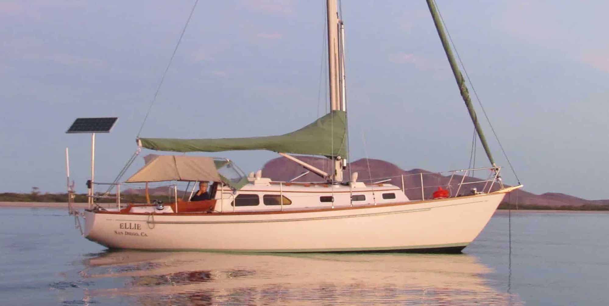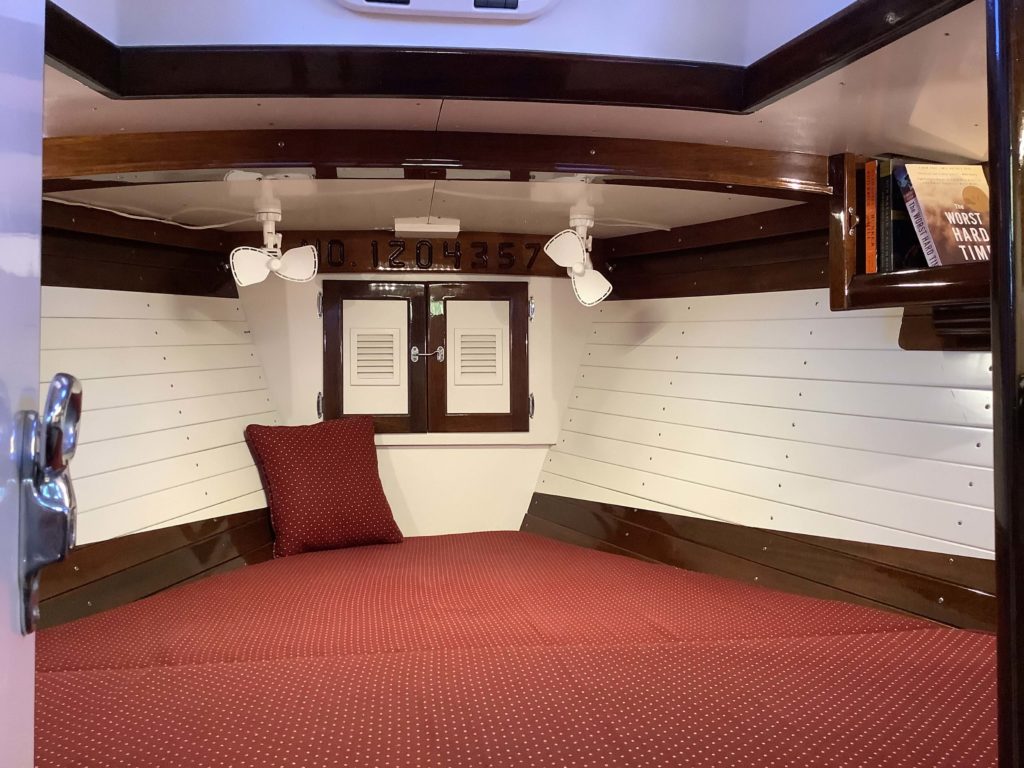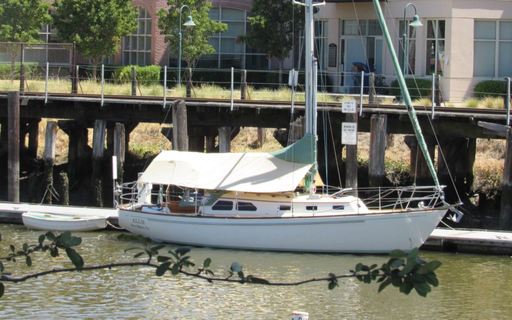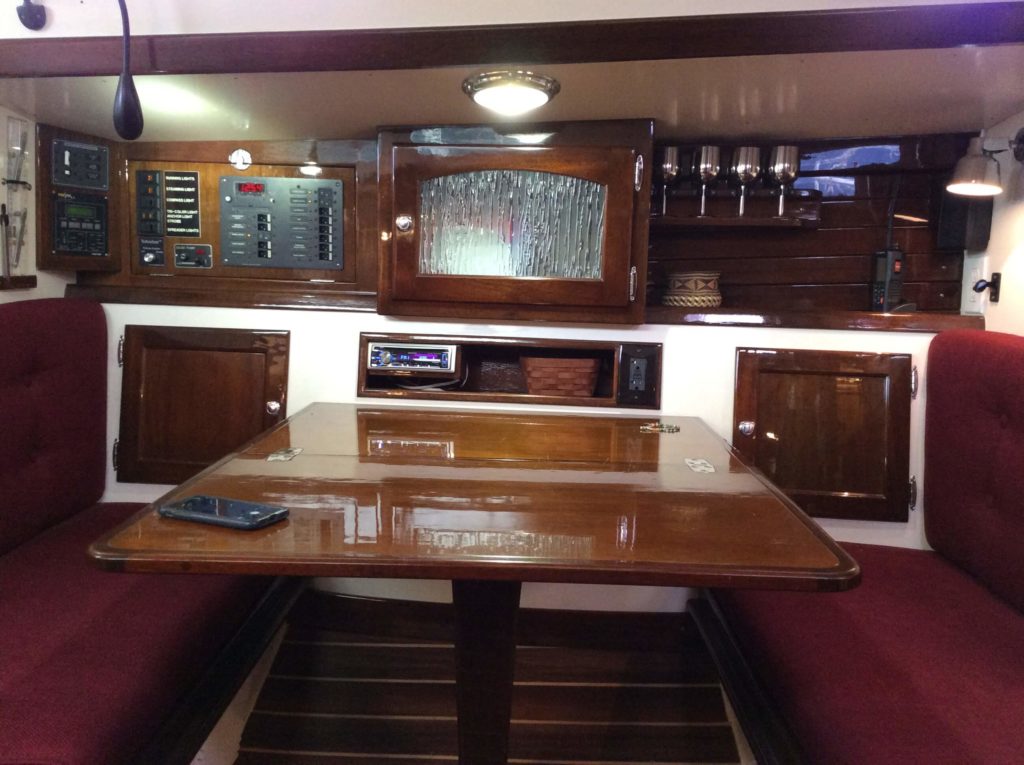 Ellie is essentially a new boat – virtually everything was replaced except the hull, deck, and mast extrusion. The interior layout remains fairly true to the original, though the Herreshoff interior brightens her up considerably, as does the addition of a hatch in the salon. The deck layout works well for sail handling and anchoring and she’s a very easy boat to singlehand. The photos show the reverse tiller which steers the boat under wind vane or autopilot. This really frees up the cockpit except when hand steering.Ellie’s owner and lifelong sailor chose this 1967 Ericson 30 as a retirement project after his woodworking career ended. His previous boats were all wooden and much larger than Ellie. She was a multi year backyard project, and when completed in 2015, cruised the CA coast and Mexico. She will be heading to the Pacific NW in the Spring.
