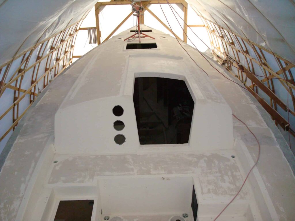 During the rebuild we removed the engine, filled in the propeller aperture, converted her from wheel to tiller, designed and built a taller lighter mast and longer traditional style bowsprit. We rebuilt her standing rigging with hand spliced SS 7×7 wire rigging. We designed and installed a simple yet elegant seagoing interior. We removed the toe rail and glassed over the hull deck joint with three layers of epoxy and biaxial for a water tight boat then installed 6 3/4″ tall raised bulwarks.