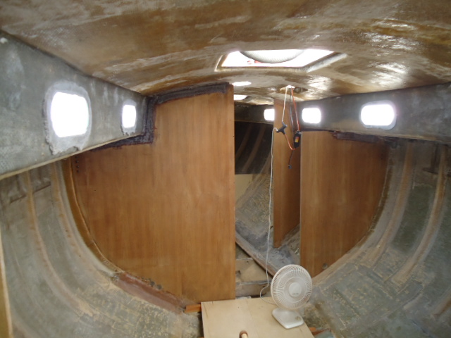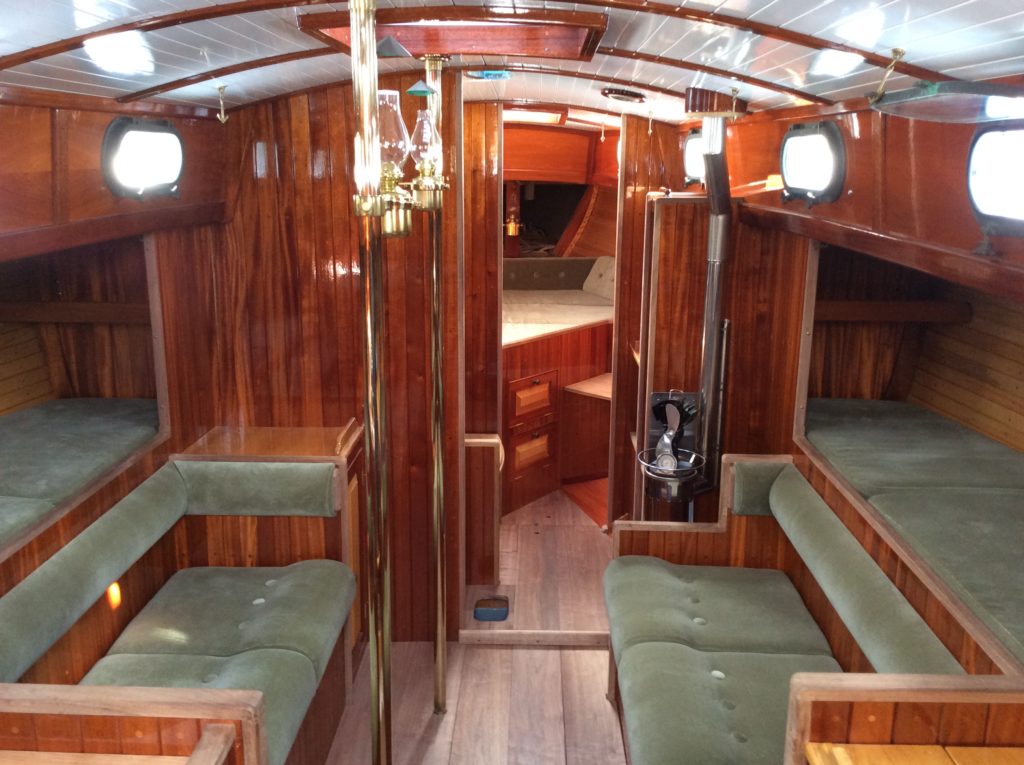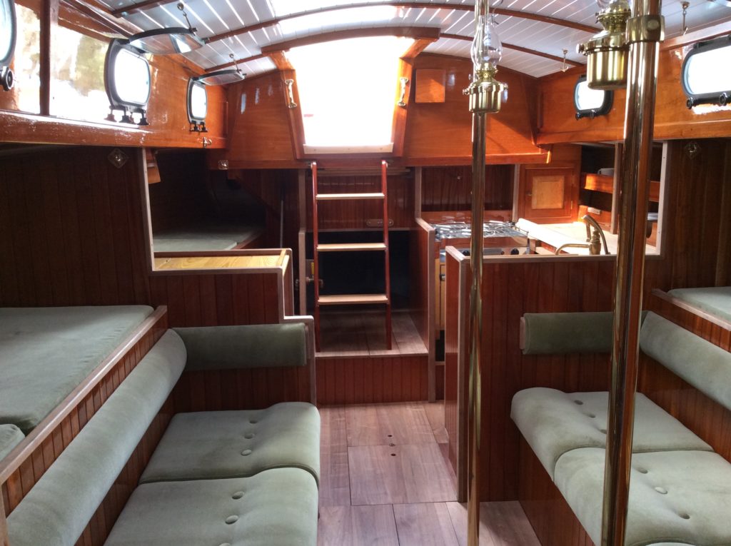 The interior is varnished V groove African Mahogany. The cabinet doors are inset raised panel birdseye maple. The horizontal surfaces are ash. The cabin sole is bare black walnut harvested locally in NC. The cabin sole from the forward cabin to the rudder post can be removed in less than 10 minuets exposing the entire bilge. Much of the interior is removable as well.