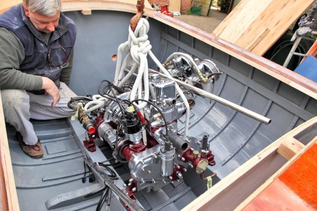The bronze fittings were custom built in the Art Nouveau style as was the boat. It had not a flat surface on it. As we progressed with the renovation the “Original” seat position in the main cockpit of “Fixitor” was a very positive indicator of her as a racing trials boat, the ribs demonstrating the original set of the turtle deck and the special connection point within the boat for the tow rope (these were not the most reliable boats). We learnt that the boats hull style was state of the art design for racing yachts of the early 1900’s and the turtle back deck typical of the power boats in many of the power boats in the 1908 Olympic games in the UK racing around the Isle of Wight. After purchase the hulk was delivered to Colin and Stephen Messer’s yard at Classic Restorations in Clewer in Windsor,UK for restoration. There was no engine and so bearing in mind that the power plants in these boats changed over the years we built up a BMC MG Magnette engine as this gave the hull the maximum speed she could make. About 16 knots.
