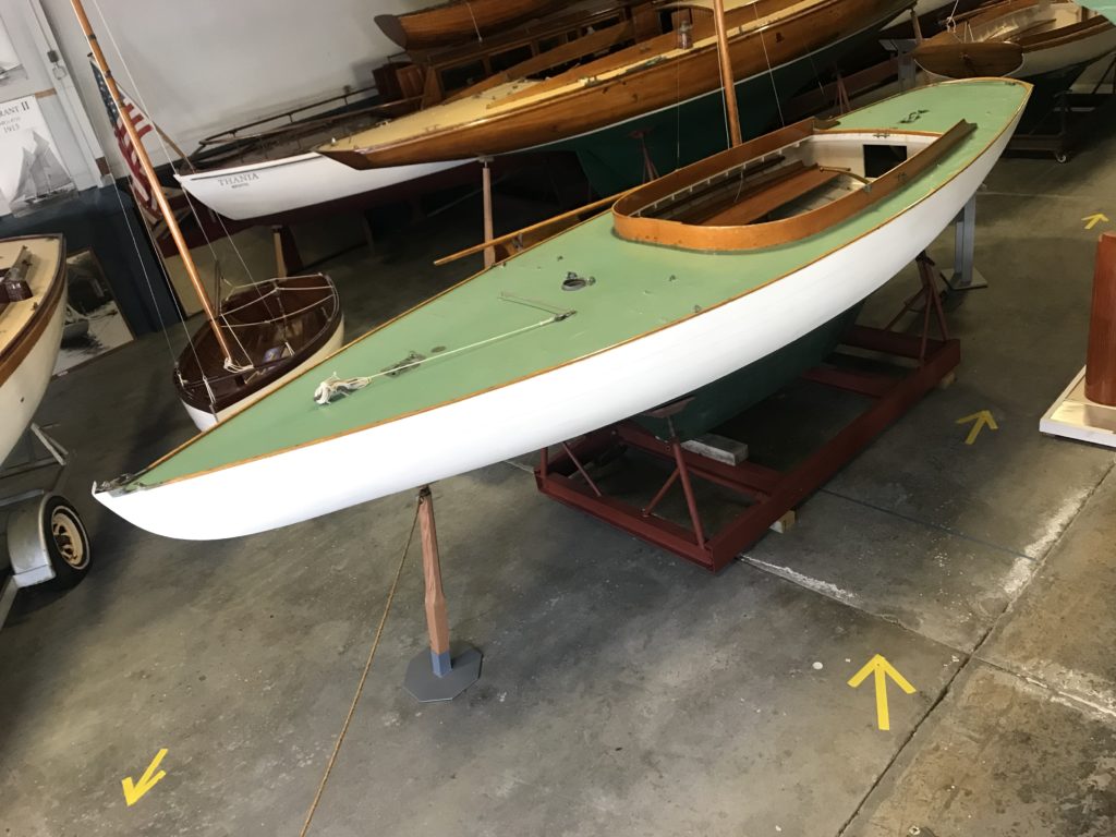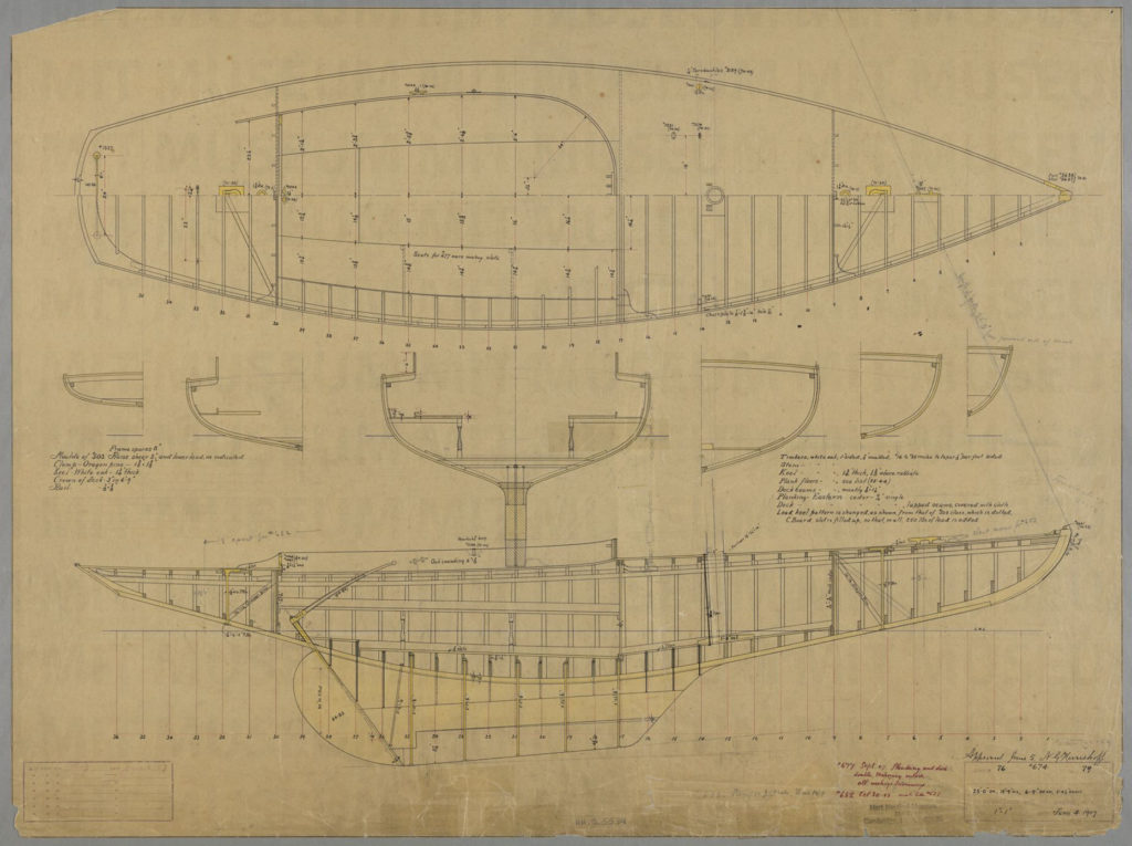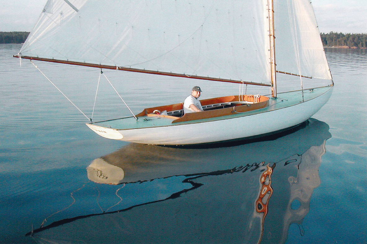 For sailing, original owner Walter Ladd’s crew hastily lowered FLICKER (HMCo. #674) from his steam yacht’s davits, brought her against the landing stage and raised sail. Ladd then climbed aboard and off he went. With husky hoisting shackles recessed into her deck, this is what FLICKER was designed for rather than racing. N.G. Herreshoff chose to modify his existing Buzzards Bay 15 design by lowering the lead ballast keel, eliminating the centerboard, raising the sheer, and beefing up the structure a little. FLICKER is a spectacularly untouched example of HMCo. workmanship, with original planking, deck, and structural members intact. There are only a few sister frames near the bow, and access panels have been cut through both her watertight bulkheads. Aside from these details not much else has changed since her launch in 1907. You can still see, for example, original pencil marks from her builders on the light lead wash HMCo. used to preserve the interior behind watertight bulkheads.Already a member? Log in herePhotos