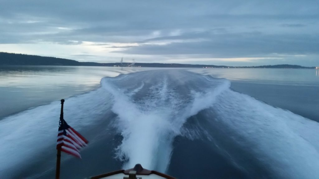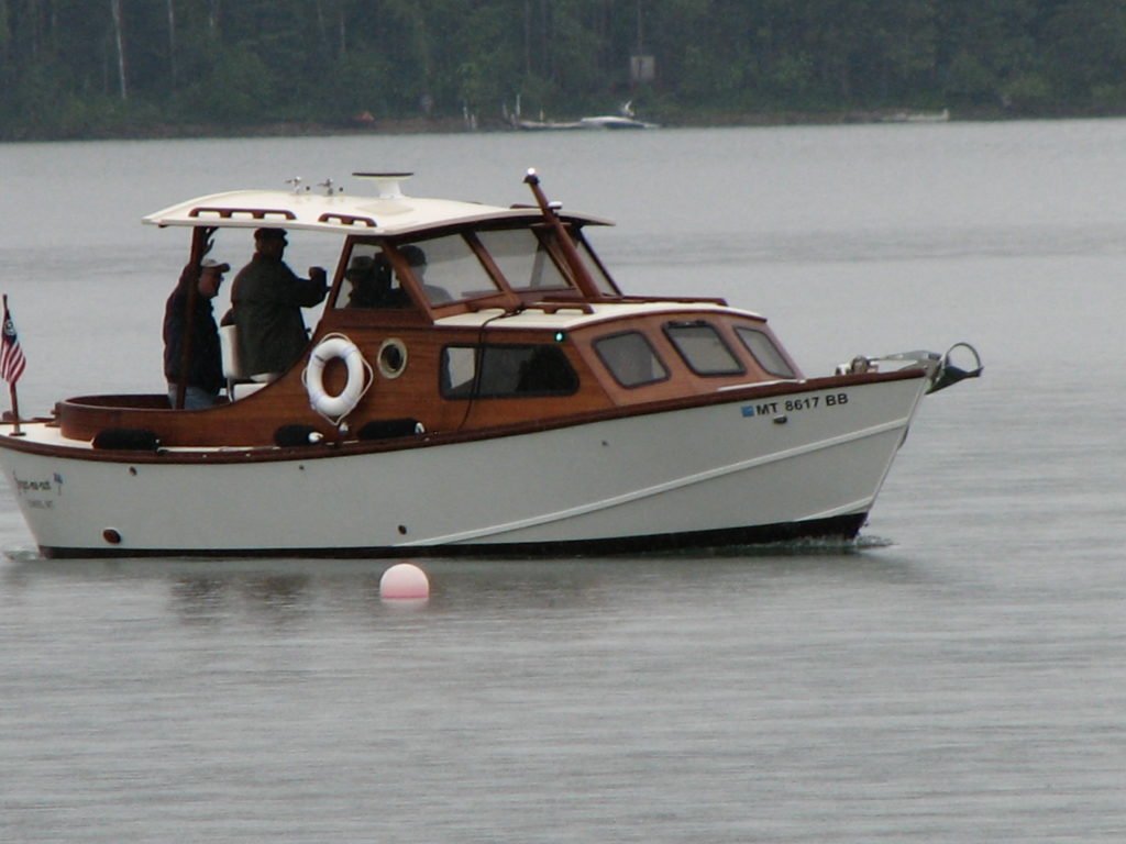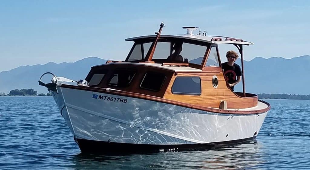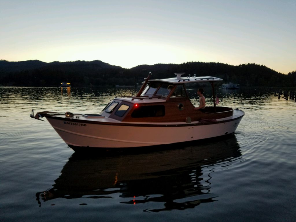 Forget-me-not is a family fun boat for Flathead Lake in Northwest Montana as well as a light coastal cruiser. A Calkins’, 1950’s rough water, plywood/epoxy hull on spruce frames, double end design built for the sand bars, waves and currents at the mouth of the Columbia River, hence the Bartender Brand. She is fancied up a bit by the owners son who was the principal builder, among many students and graduates of the NorthWest School of Wooden Boatbuilding.