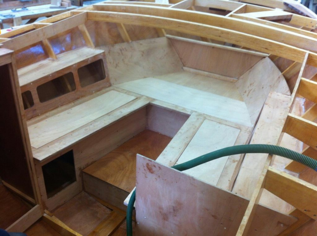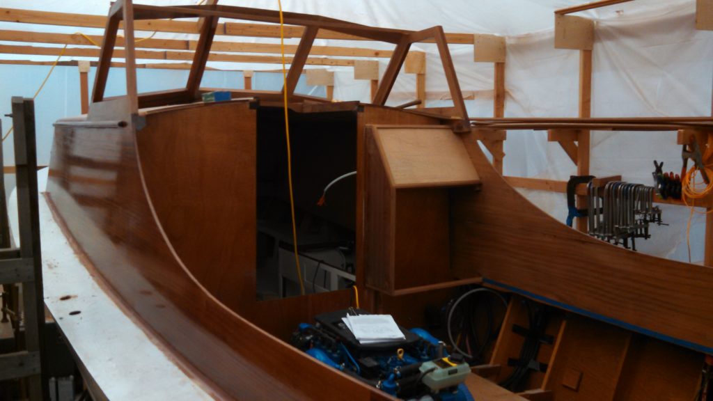 Sapele exterior house and well deck coaming with custom white bronze fittings and portholes. Cherry wood interior accents and table. She sleeps two with a mini-galley and enclosed head. Set up with GPS auto pilot, radar and AIS for Puget Sound and the coast.