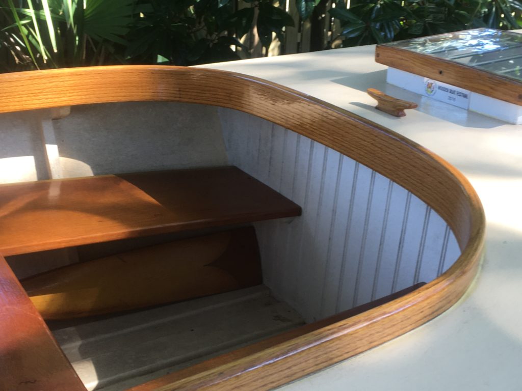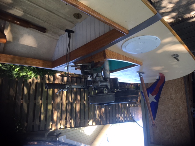 The fantail transom was designed to accommodate an outboard motor well with decking all around. The intention was to use my old British Seagull motor, stored in my shop for many years. This designed motor placement provides for convenient repairs when stranded on the lake.