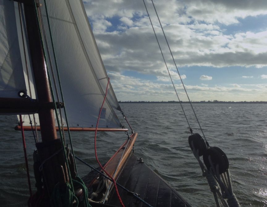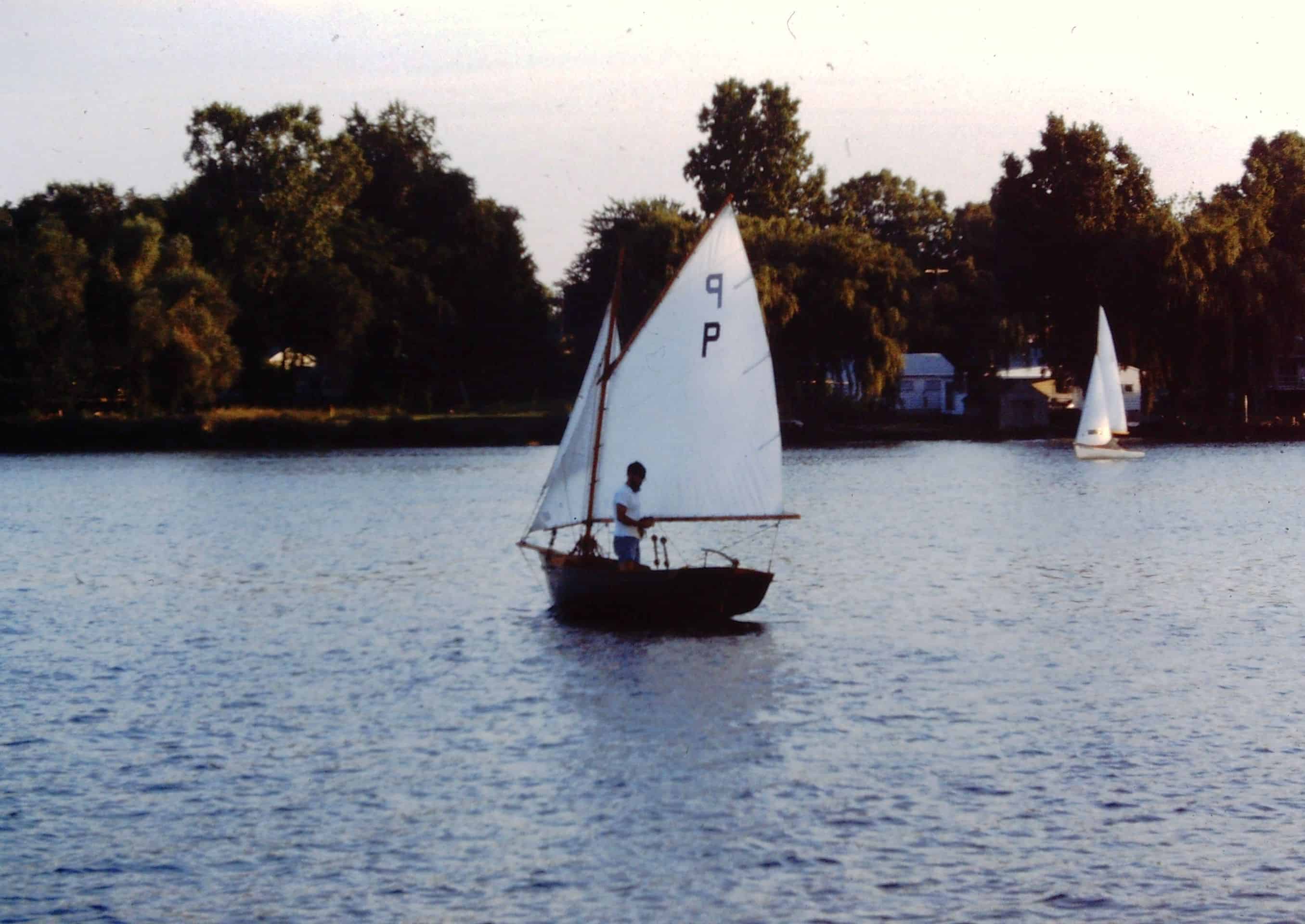 Frisky Lady is a Pepper 15 gaff sloop built in 1978. Most of the wood (foredeck, seats, rudder, trim) is teak. Secondary propulsion is by oar.