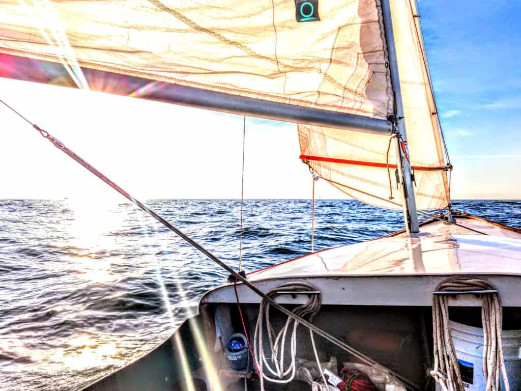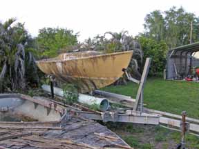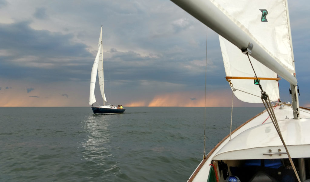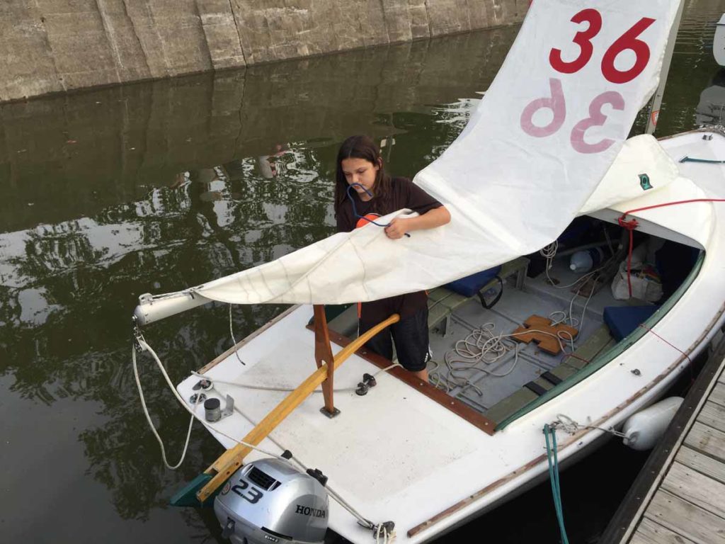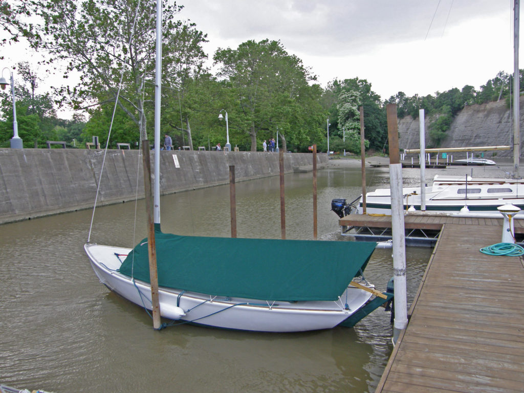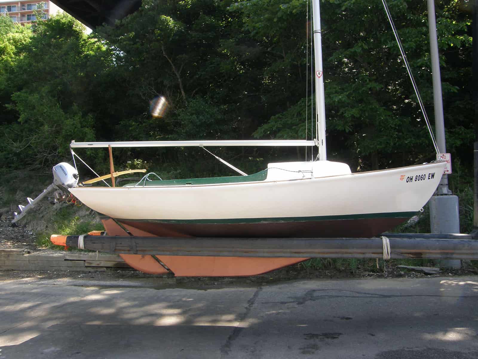This is a very early Cape Cod Bullseye with circular bilge hole and molded rub-rails. This boat was originally part of the Ocean Reef Club fleet in Key Largo FL. It was sold as part of an auction lot, and my father bought it from that purchaser. He suffered a spinal injury before getting her in the water. After many years as a yard ornament/birdbath in Ft. Myers, FL., I retrieved her to Cleveland for restoration. In the process I removed the floor for repairs and found non-standard things like a slug of cement in the bow. I have been sailing her out of the Emerald Necklace Marina on the Rocky River, west of Cleveland since 2012. Originally designed by Francis Herreshoff for use on Buzzard’s Bay, MA she is well suited to Lake Erie conditions, with a full keel. The Bullseye is still in production by Cape Cod Shipbuilding. I pick my weather carefully.Already a member? Log in herePhotos