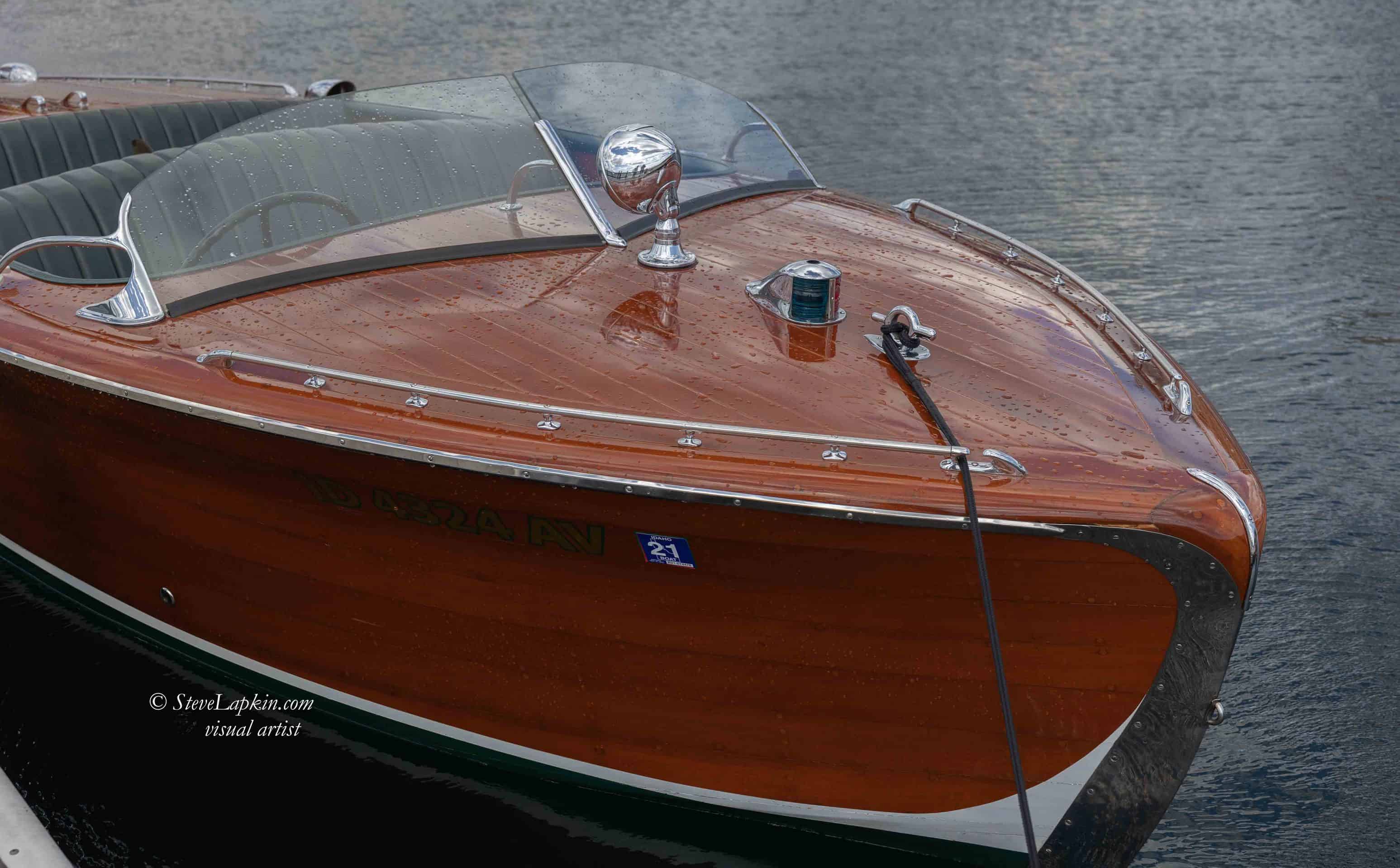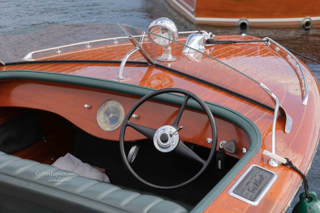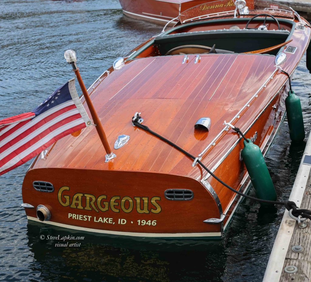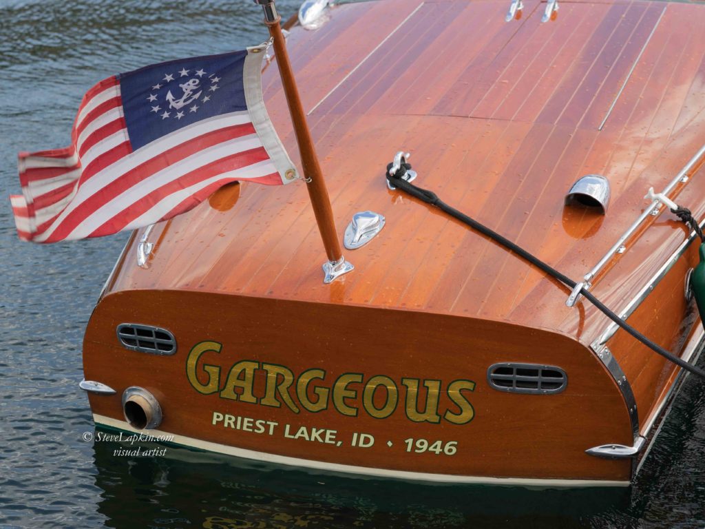 The name of our boat is Gargeous and she is a 19 1/2 foot 1946 Gar Wood Commodore. We bought the boat in 2013 in Tahoe from Suzie Selvidge, her husband Ken had died the previous year. I have added “Priest Lake, ID 1946” to the stern and completely replaced the interior plywood with new mahogany planks that match the boat. She has won several awards at various shows we have attended (Whitefish Woodies, Sandpoint, and the Priest Late Dry Rot). She has a 230 Crusader for power and has been clocked at 45 MPH. She is kept in the water all summer at Priest Lake and used often for cruising with friends and family.