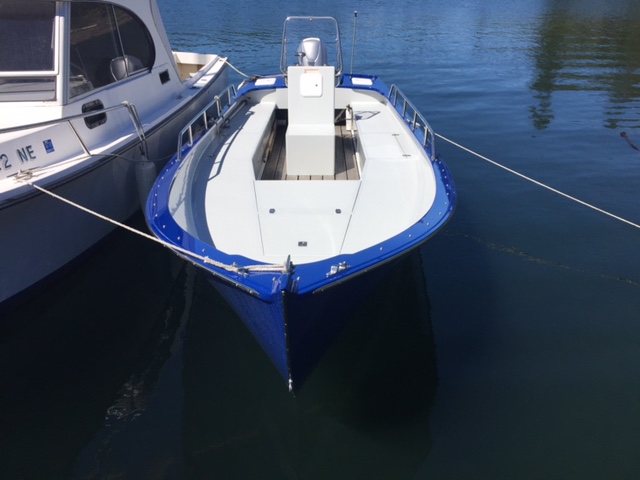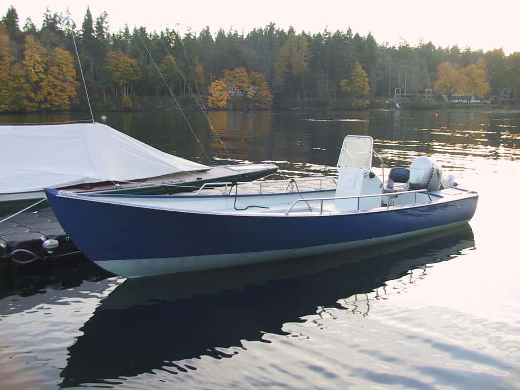 Designed by Paul Gartside as a custom design for the Northwest School of Wooden Boatbuilding this is a very versatile skiff. My wife calls her my water motorcycle. I used this vessel for year round commuting across Puget Sound and I liked her so much I kept her as a utility boat when I retired in 2014. I currently use her mainly as a shore boat to reach my moored sailboat and for quick dashes across the sound and general messing around in boats. She is built of strip-planked western red cedar with two veneers of mahogany vacuumed bag over the strip planking all using West System Epoxy. She is very sea worthy and has safety taken me across the Sound in 45 knots of breeze and 5 foot square waves. She will top out near 30 knots with her 90 HP EFI Honda outboard, but I run her at around 16-18 knots as that speed is much more pleasant. She trims well with a couple of very small trim tabs and is an all around great boat and a blast to run.Already a member? Log in herePhotos