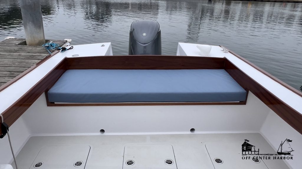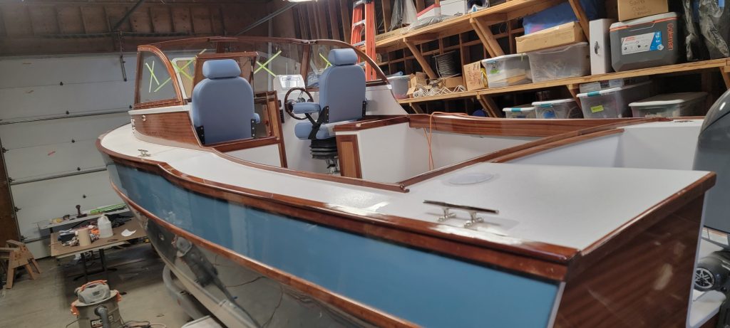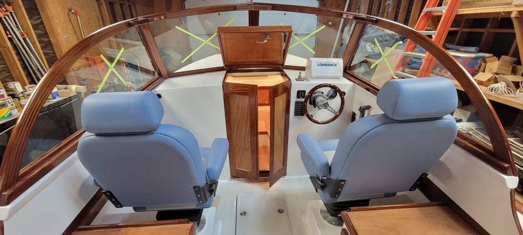 After bottom paint, flipping the hull, and getting the sole in, we realized how little headroom there would be in the cabin and decided this wasn’t going to fly as is, particularly with my wife. So, I designed a cuddy cabin with 14” more headroom at the helm bulkhead and 10” more at the forward end. While not intended to be an overnighter, there are two 7-foot berths and a porta-potty now with adequate headroom. The cuddy makes all the difference in the world for us.