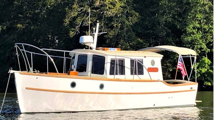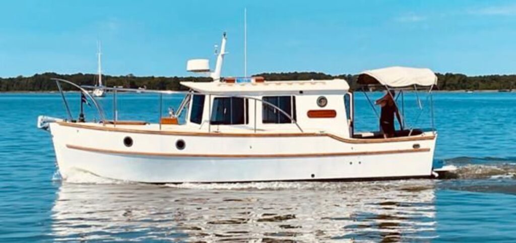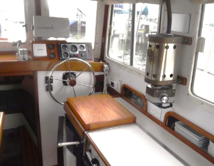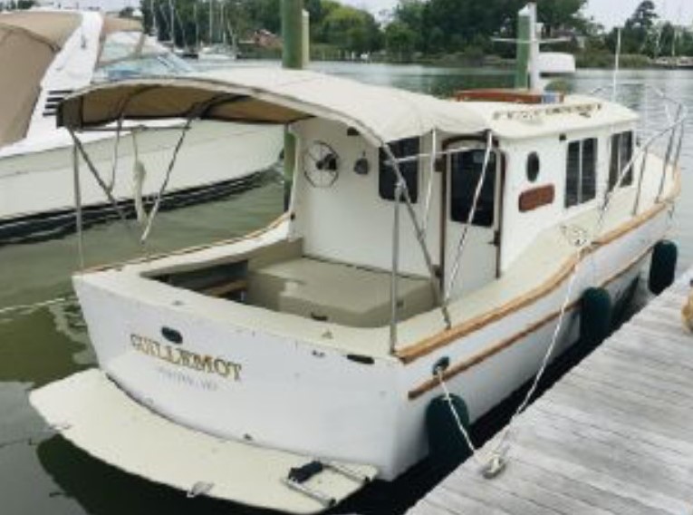 GUILLEMOT is a 27 ft. salty, power cruiser built by Devlin Designing Boatbuilders in 1993 with award-winning construction to take a cruising couple safely and in comfort across east coast waters to ports from Newfoundland to Florida, perhaps Northwest up into Alaska and British Columbia, or enjoying local cocktail cruising in Chesapeake Bay.