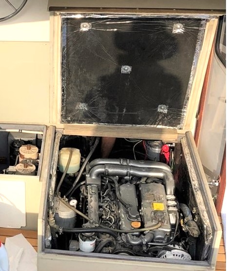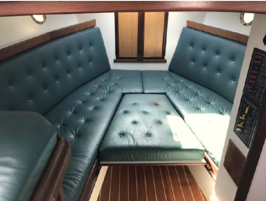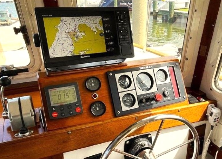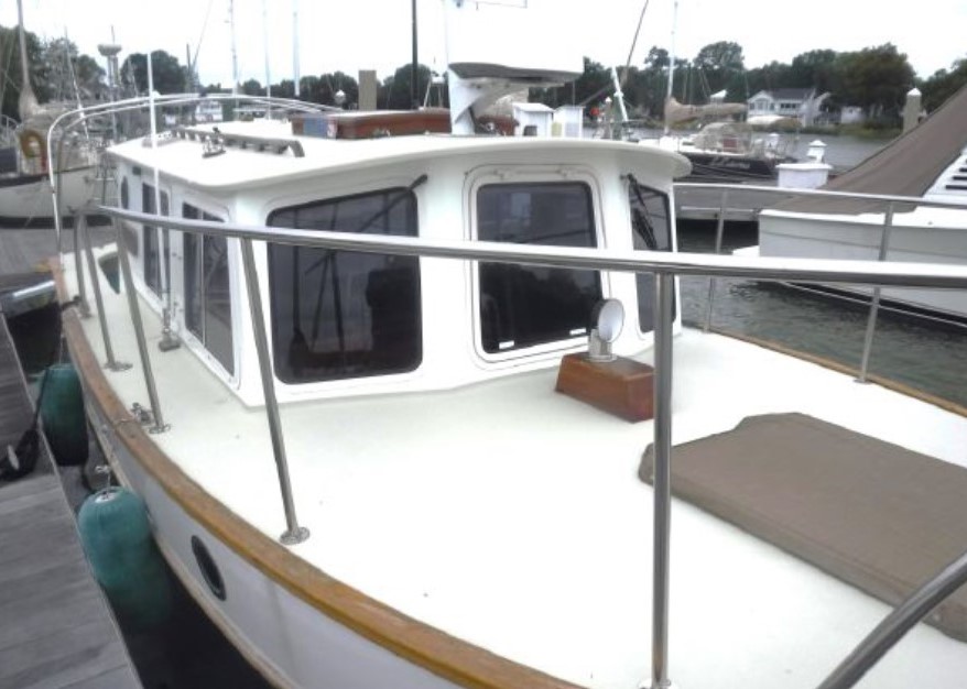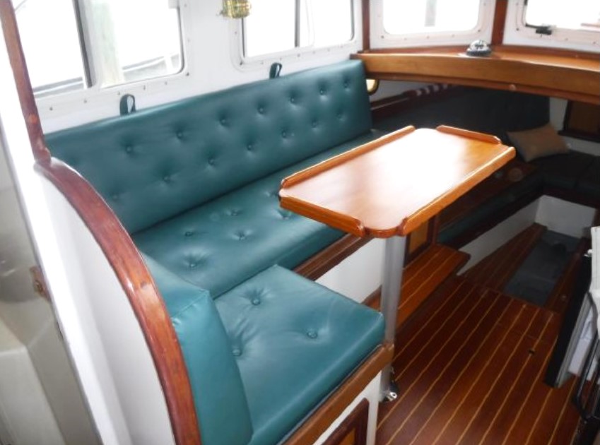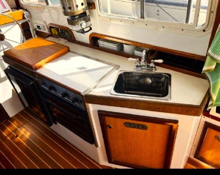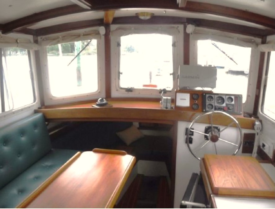 The cabin interior has two areas: the first is forward sleeping quarters, limited headroom but very wide, there are 2 generous lengthy bunks, or conversion to a double berth, multiple truly large storage areas, a large overhead hatch with solid, laminated glass and abundant ventilation. Then aft, the main cabin has full beam, 6ft. 4in. standing height. The cabin is surrounded by generous sliding windows with built in screens and dropdown curtains. Forward looking from the interior helm location large, safety glass windows provide widespread visibility. The main helm station has recently installed complete electrical navigation gear, hydraulic steering and engine controls. Next aft on the starboard side is the galley providing extended counter space, large, easy-opening storage lockers, sink, refrigeration and stove and oven plus a microwave. On the port side of the main cabin is a long, L-shaped settee with a pull down, side panel providing large lockers at standup height for the galley. Further aft to port the head has its own compartment door entry with sink, hot and cold shower, and electrical fresh-water flush toilet.Already a member? Log in herePhotos