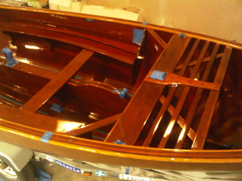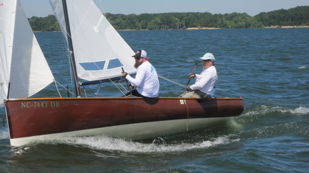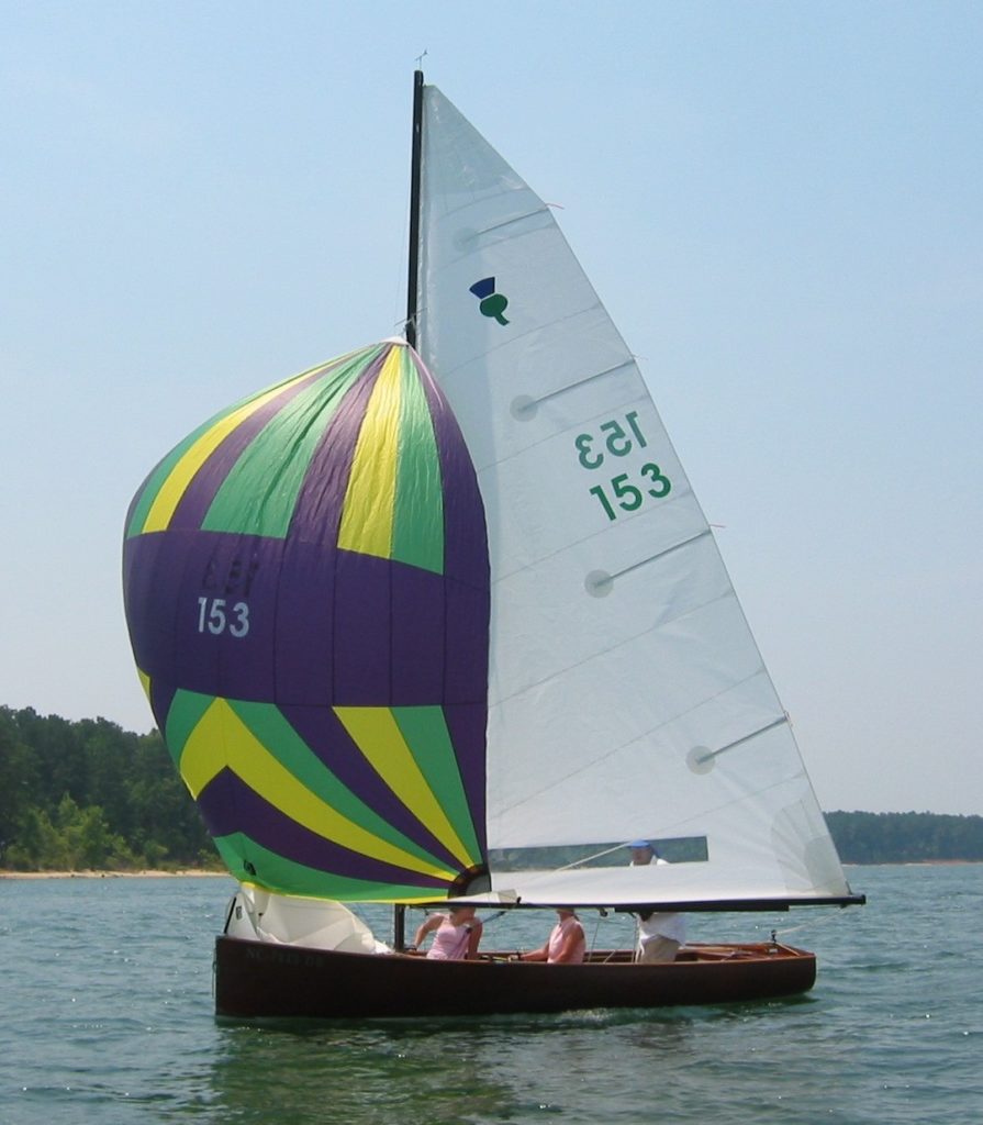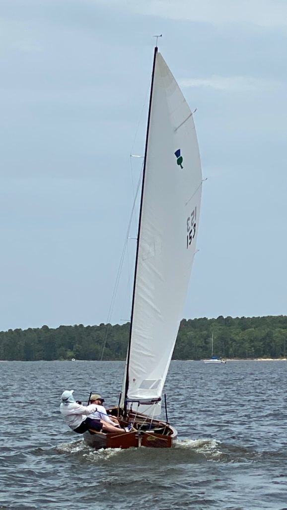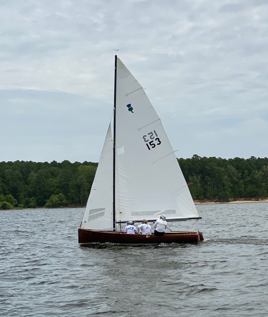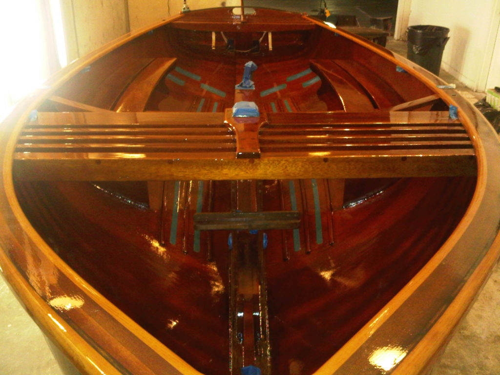 Early Gordon K. “Sandy” Douglass designed Thistle Class Sailboat. A Plumb Bow, Plumb Stern, Round Chine, open cold-molded mahogany hull, and Wood Gratings distinguish this lovely 17 foot class. This is an early example, which was assembled from a 1947 Douglass & McLeod Kit, (Hull #153), in the mid-late 1950s by a previous owner. I’ve done a bit of refurbishment, maintenance, and updating. Beautiful dark red mahogany w/ clear finish natural insides and out. She is still actively sailed and raced.
