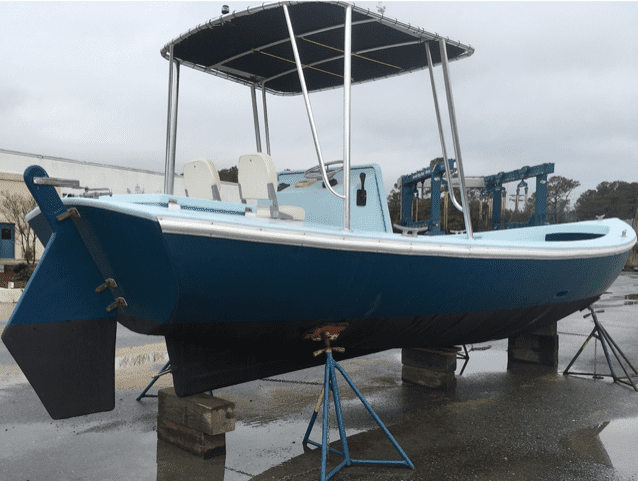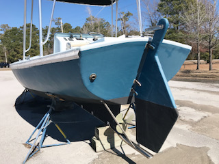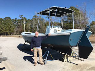 The boat has been named Hope for Haiti to convey its intended purpose. As an entirely volunteer effort, the construction was a multi-year project with multiple interruptions. The most notable was its first unpiloted sea trial during hurricane Florence, when the completed hull was washed off its stands outside the boat construction shed and driven by the wind and storm surge from Jarret Bay across a flooded field and dashed against a grove of pine trees. The boat was recovered by dragging it back to the shed with a backhoe. The hull was undamaged; the holds were dry; but there was a lot of mud to scrub off the bottom before it could receive its anti-fouling bottom paint. With that trial, Hope for Haiti proved its sea worthiness and ruggedness for mission service.