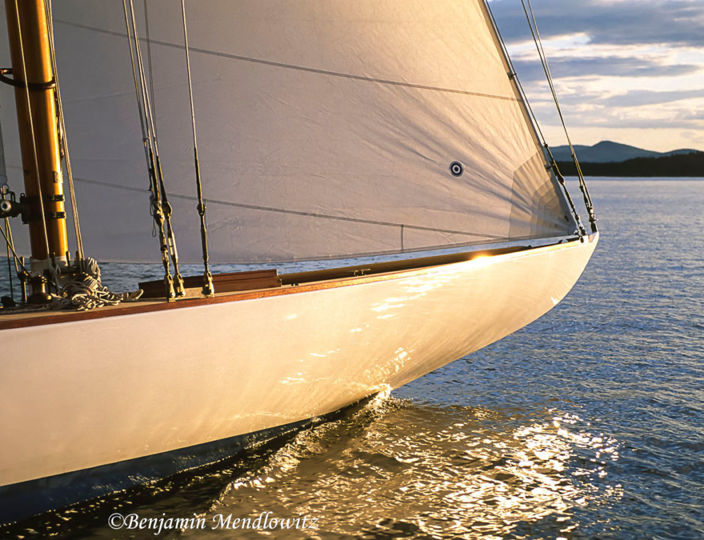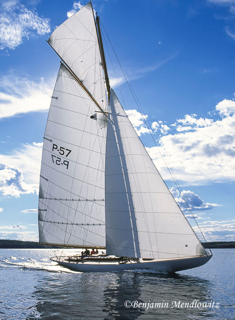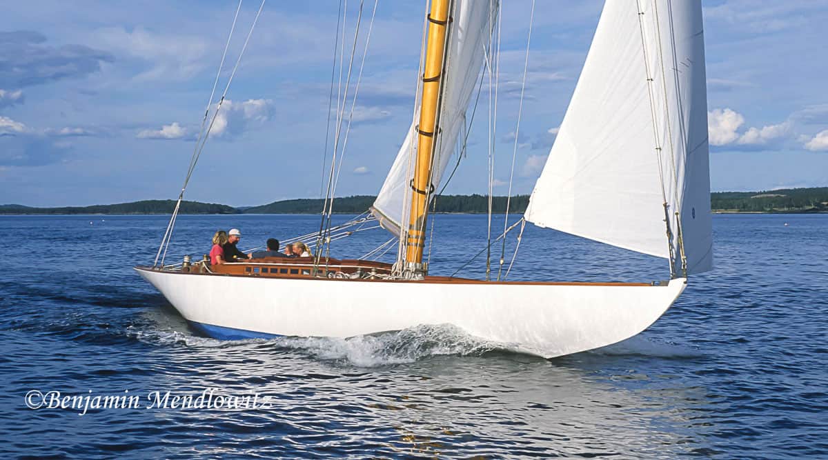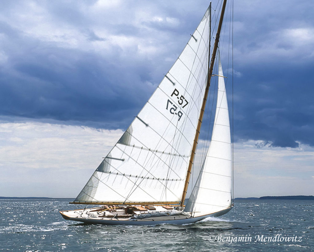 Rescued as a derelict lying in a Cape Cod bramble and trucked to Jeff Rutherford’s yard in Richmond, CA, this P-class sloop took on a new life there but retained her original simplicity: no engine and no systems. For sport, however, she carries a gaff topsail, and for elegance, a teak instead of a canvas-covered pine deck.