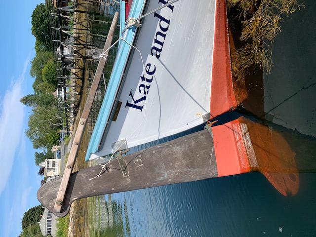 This boat has been repaired by me, and set up as a day sailer. Who knew it would be so much fun to sail these boats in that way? I’ve made a custom mount for an outboard motor, and also, this year experimented with an electric motor with an innovative installation.