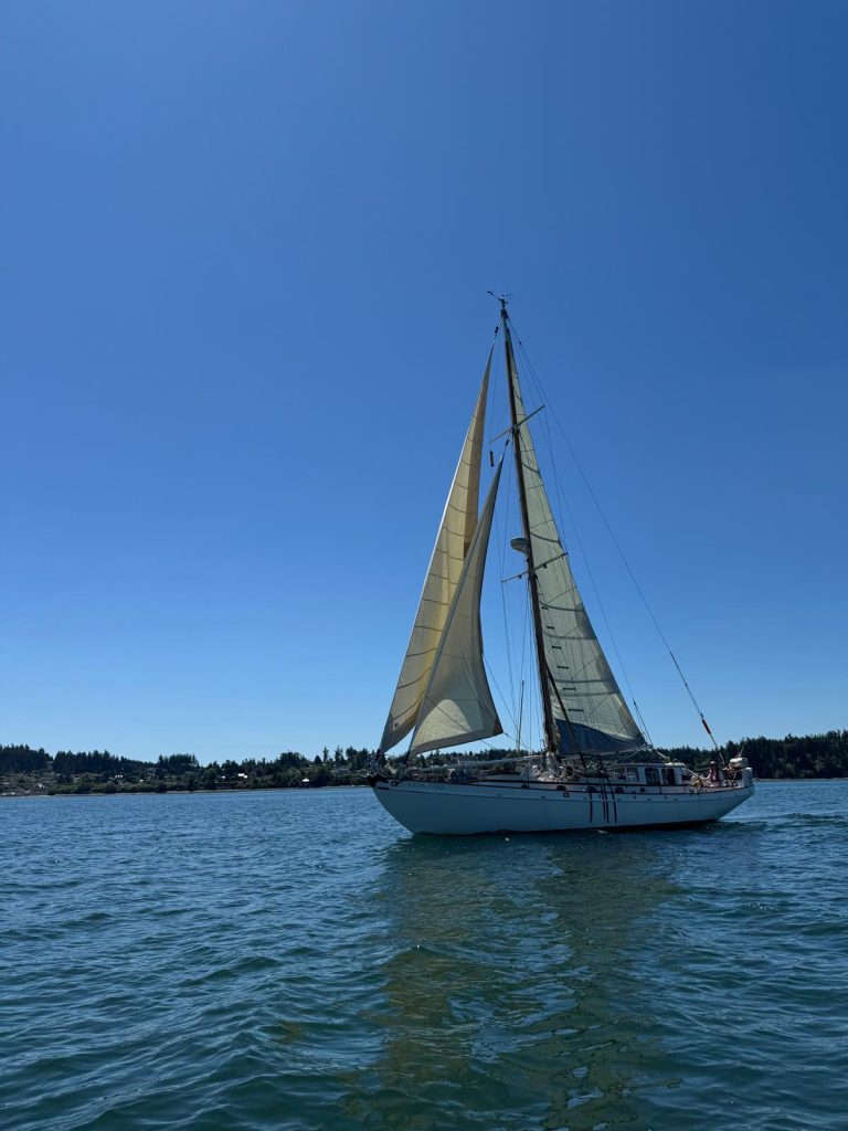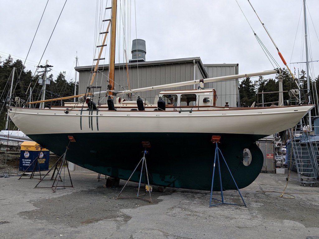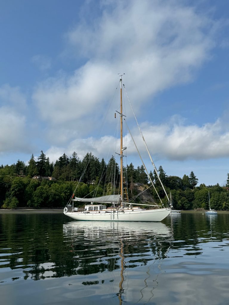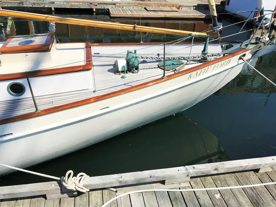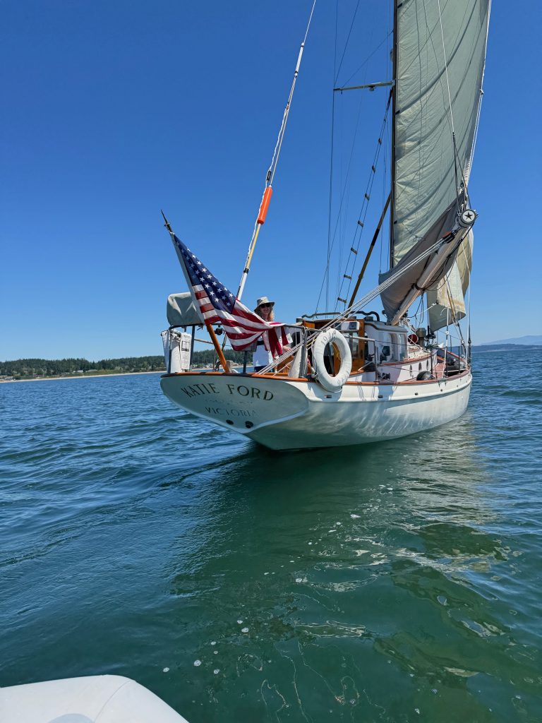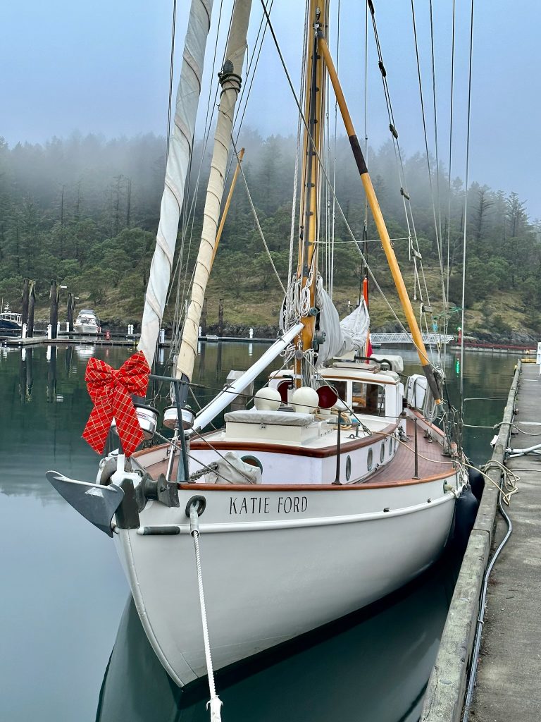 Thanks to the dedication of a handful of faithful stewards over the years, Katie Ford remains in remarkable condition. Beginning around 2009, she underwent an extraordinary refit in Port Townsend: Brion Toss Riggers replaced all standing rigging and lifelines; Carol Hasse at Port Townsend Sails provided a complete set of new sails, and Robert d’Arcy, master of the schooner Martha, directed a once-in-a-lifetime restoration, resulting in a completely new hull below the waterline, with Purpleheart ribs and Yellow Cedar planks, the replacement of all 18 keel bolts with silicon bronze, refinishing of cockpit coamings and doghouse, re-powering with a 60 hp Beta diesel, installation of new fuel and water tanks, complete rewiring and other systems upgrades including through-hulls, circuit breakers, head replacement and re-plumbing. The original spruce mast was stripped and refinished, with all mast hardware pulled and re-bedded. To prepare for the 2025 season, Katie Ford’s elegant mast is currently being stripped and refinished at Emerald Marine Carpentry in Anacortes.