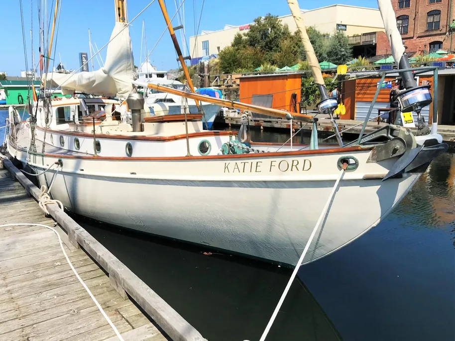 Katie Ford was Heine Dole’s grandmother. She is also a one-of-a-kind pilothouse cutter designed and built by Heine Dole in Astoria, Oregon in 1946.Heine Dole was a respected figure in the boat-building community, known for his deep understanding of nautical design and meticulous craftsmanship. His boats were often tailored to the specific needs and preferences of his clients, resulting in unique and highly regarded vessels. Katie Ford was designed to be Dole’s personal yacht: he wanted a boat that was faster for its length than his first boat (the Chantey), but “as comfortable at sea as a 90’ halibut schooner.”