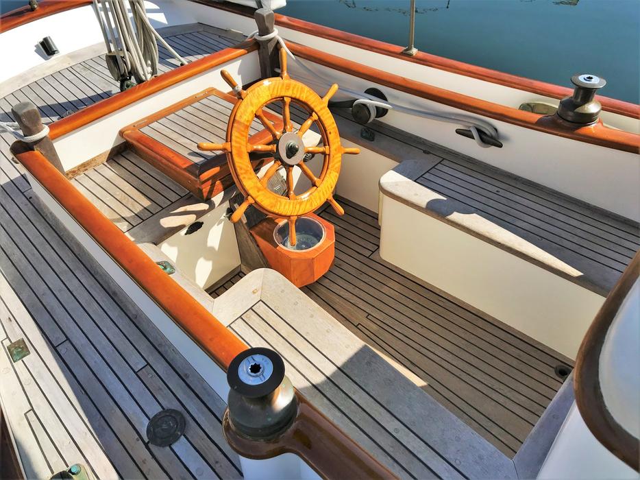 Built for the rainy Northwest, the Katie Ford’s cozy pilothouse with inside steering station affords excellent visibility through distinctive vertical windows, while the second wheel at the aft end of the cockpit makes her a true “pilothouse sailing yacht.” Down below varnished woods gleam and glisten, while her layout features a gorgeous “key-hole” bulkhead between galley and salon.