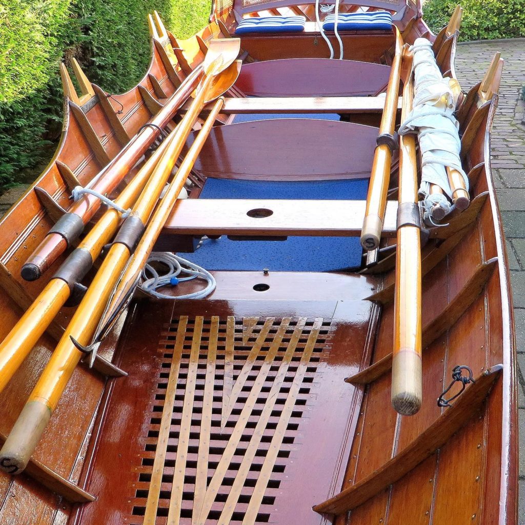 Mahogany planks over oak frames, length 7,34m, width 1,33m, sail 4,95m2