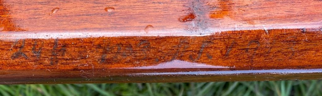Handwritten on the bottom side of the floor planks: ‘24ft skiff no.3 HS 1913’