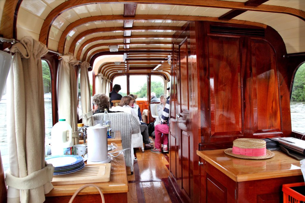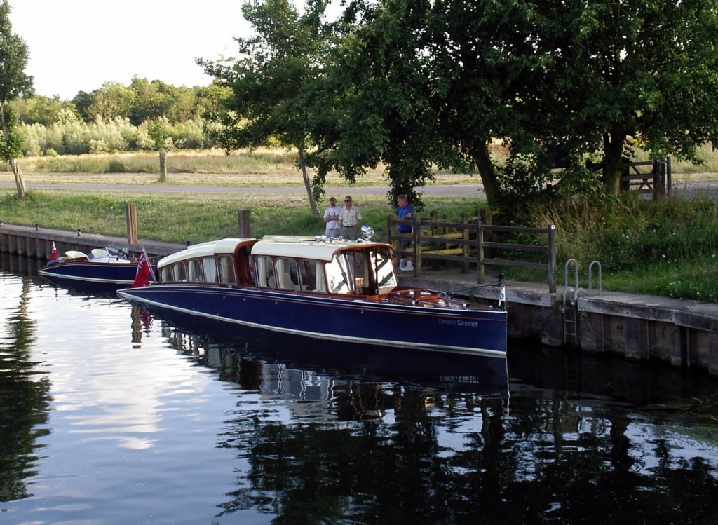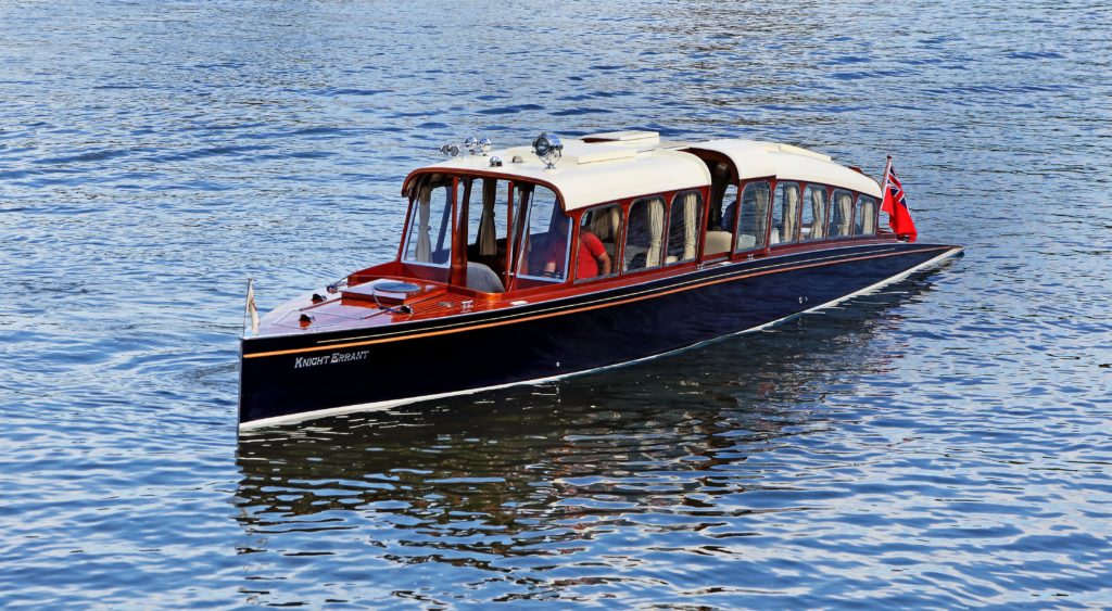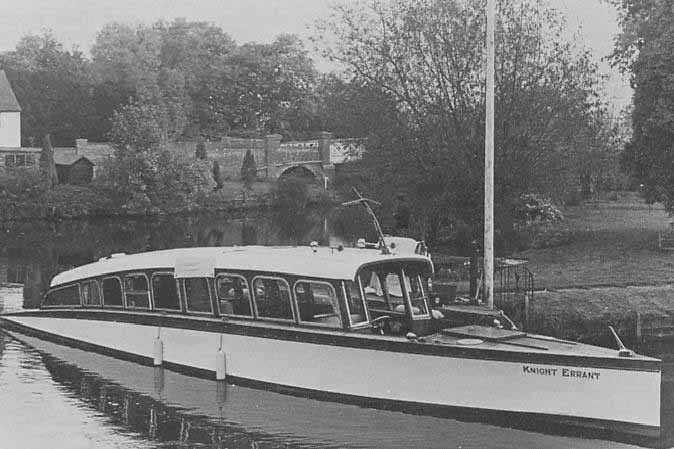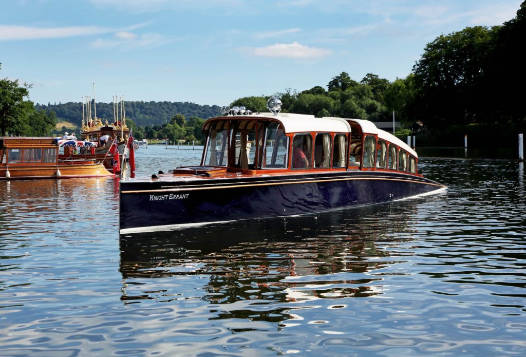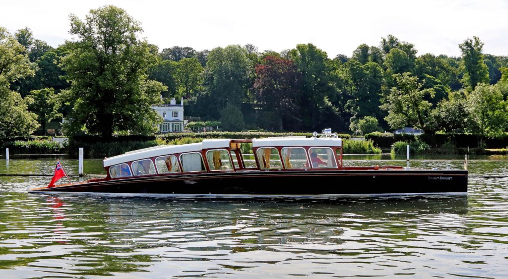 Knight Errant was one of seven 50ft slipper launches of which only two remain and was built in 1934. She was the only one of her kind ever built with a cabin. So in both size and construction she is unique. The River Thames slipper launches were popular along the river between Windsor and Maidenhead from the 1920’s to the 1960’s generally as hire boats. Normally between 23 and 35 feet long and without cabins. Nowadays smart houses on the river have an example of one of the remaining few moored on their banks.Knight Errant, with her cabin reminiscent of the Art Deco railway carriages of the 1930’s, was designed by John H Hobbs the manager of Meakes of Marlow’s Yard in Marlow, UK who built her. Notable owners have been John Dolphin the flamboyant CO of the Special Operations Executive Station IX during the second world war and subsequently Chief Engineer at the UK Atomic Weapons Research Establishment. In later years Knight Errant came in to the ownership of Diana Dors as a weekend place. She kept it conveniently at Bray Studios so that she might entertain her fellow actors. Knight Errant is famous for towing a water skier in full black tie and dinner jacket on a silver tray past the Houses of Parliament in the 1950’s. We applied to repeat this feat in 2014 but the Port of London Authority summarily refused.