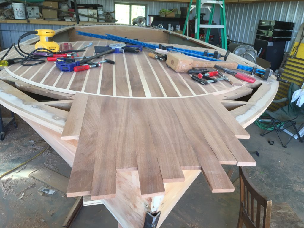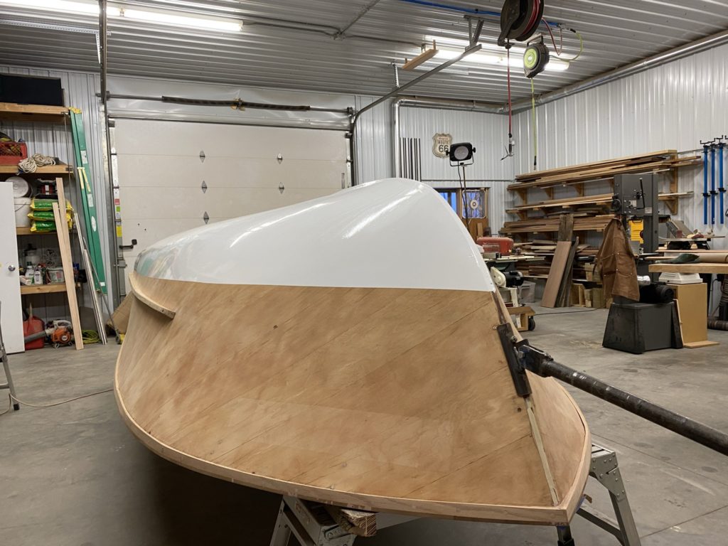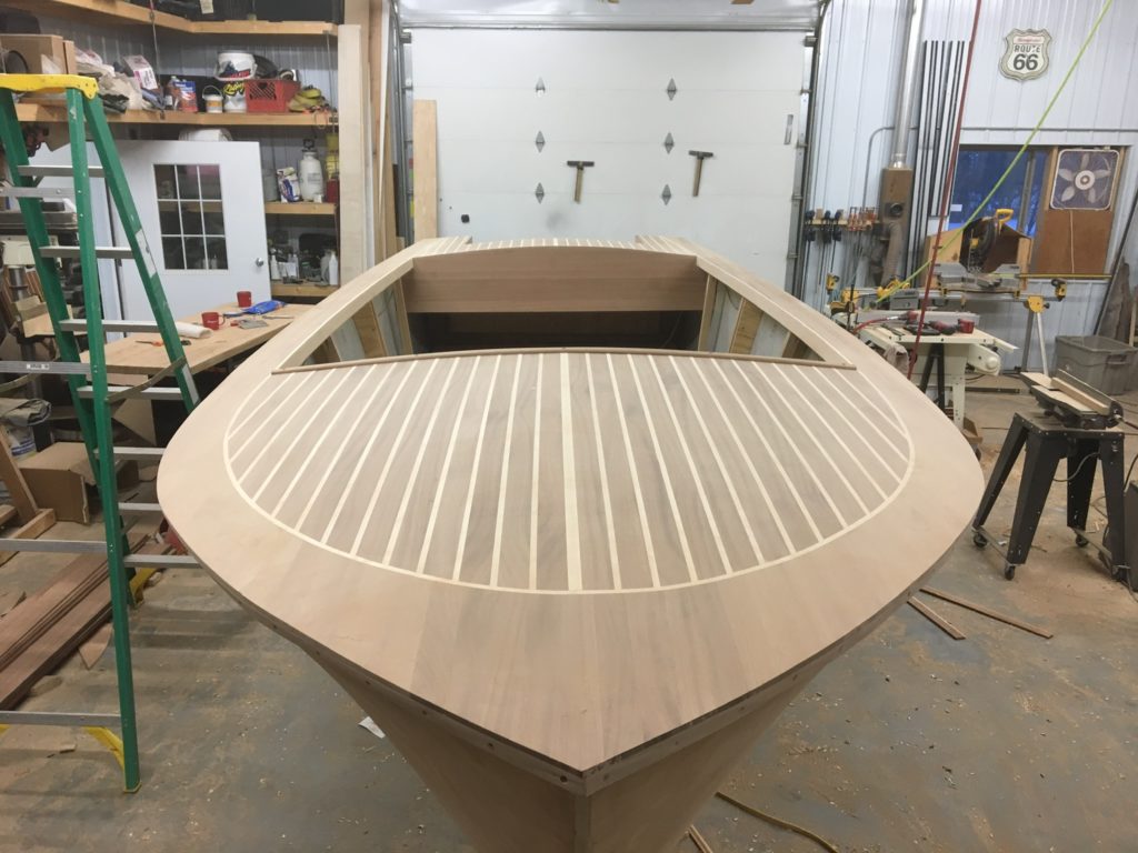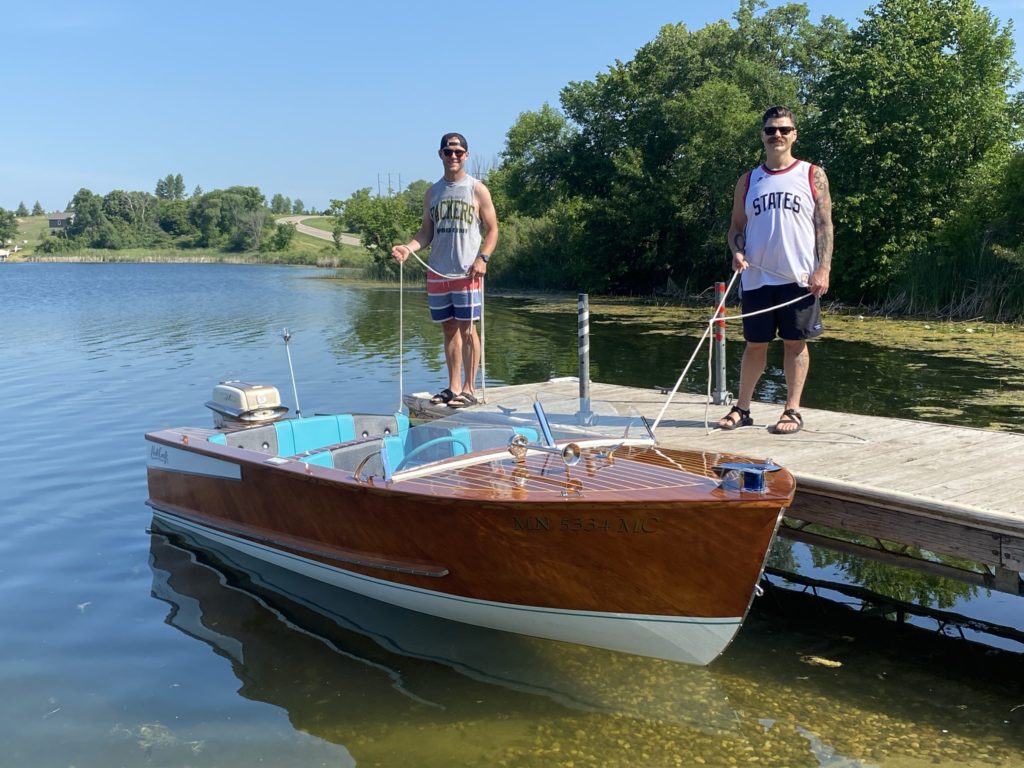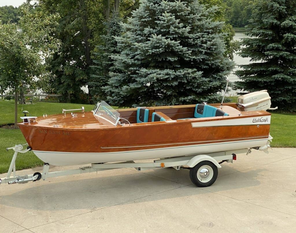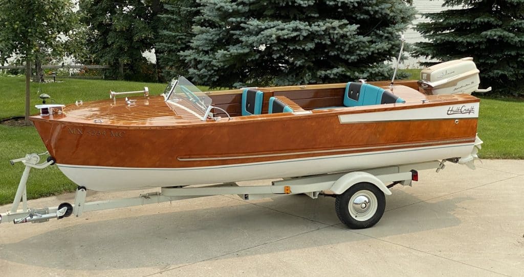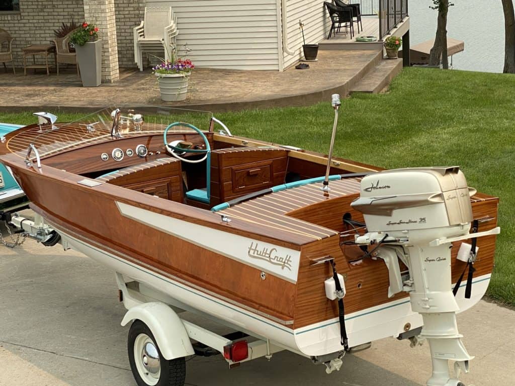 HultCraft boats and I grew up together on Sunday afternoons on Lewis and Clark Lake near Wausa, Nebraska. I always wanted my own so when a salvage dealer hauled this boat into his yard I immediately bought it. After getting it into my shop I realized how badly rotted it was. Removing the transom and 6” of hull I started her second life. I added My own take on the restoration, because after all, they were sold as a kit boat if you wanted to build your own. The deck is Sapelle Mahogony and Birch inlayed. I was able to locate a Johnson Super Sea Horse 35hp motor to finish it off. The original Balco trailer was sand blasted, repaired, and repainted to carry Lune-atic to the water.