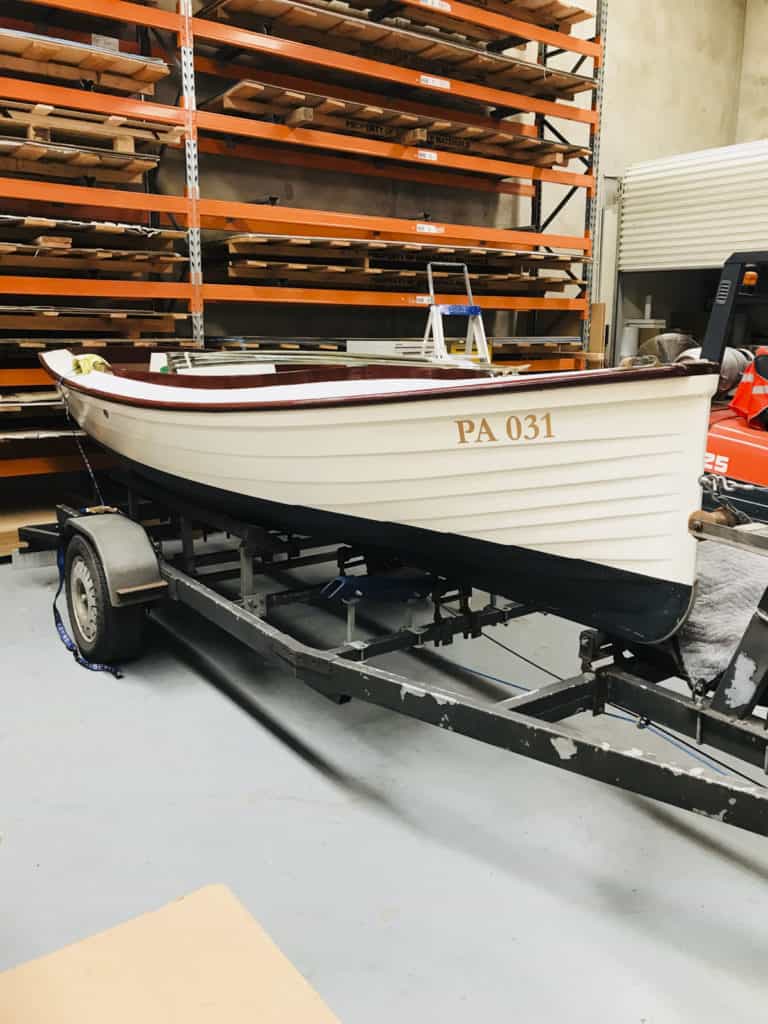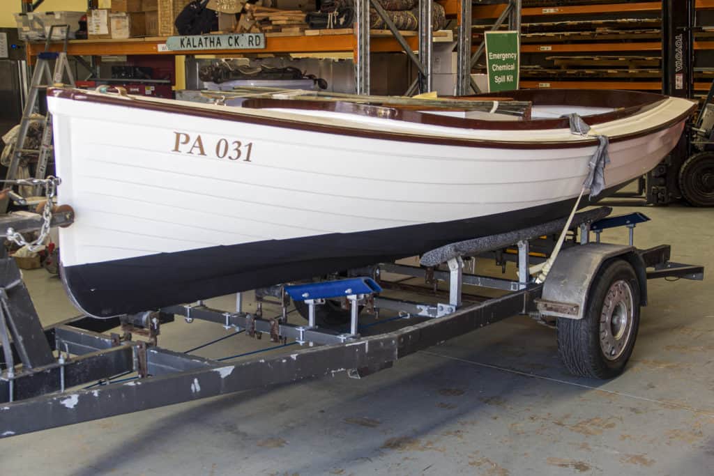 Built in 1898 “Larrigai” is an original small rowed fishing boat built on the beach during the late 1890’s Depression years in Australia. It is of a type built by out of work men of Melbourne to fish the prolific shallow waters of Hobsons Bay at the North end of Port Philip to feed their families. Port Phillip is the large bay on which Melbourne, is located. The boat was fitted with an engine in 1931 and has been in continuous use.It was last refurbished in 2019. No new lapstrake planking was needed as King Billy pine is almost indestructible. The transom is also a single piece of King Billy. 18 Sister ribs were installed during restoration. The boat predates the formation of Australia as a country by two years! By the 1920’s all boats built of this type of fishery had a wine glass transom shape. The boat has been part of the Albert Park Yachting and Angling club since its inception in 1909. The club has 40 similar “Clinker Built”, or Lapstrake, boats in its beachside shed still fishing regularly. Most were built from the 1920’s to 1960’s.Already a member? Log in herePhotos