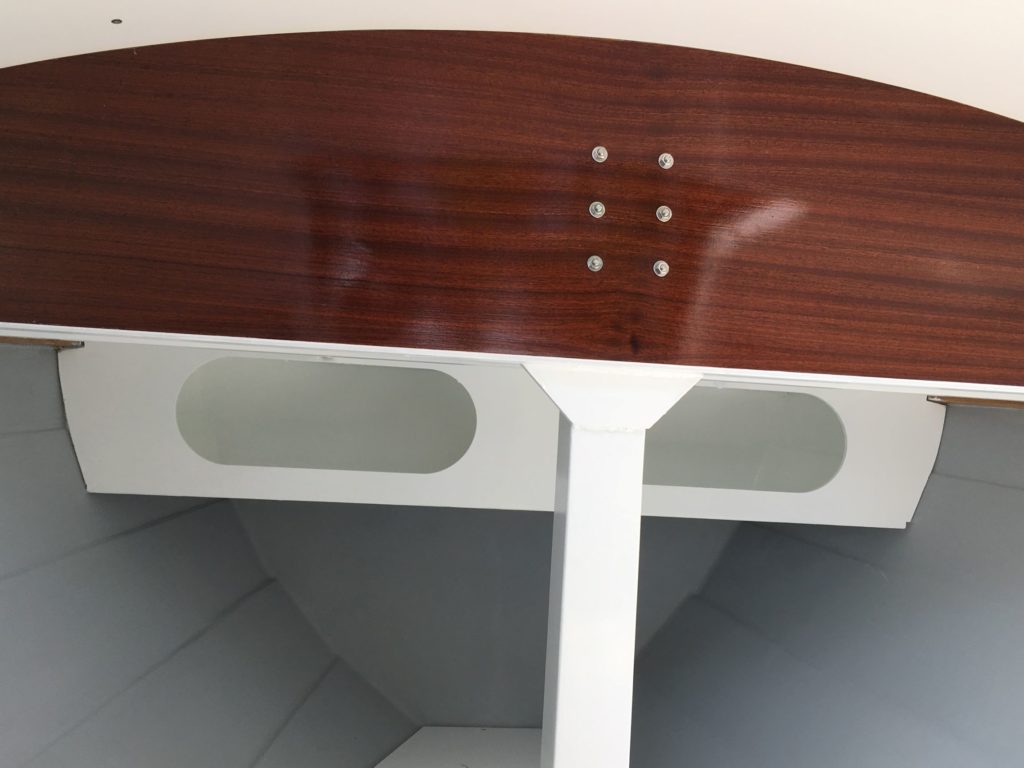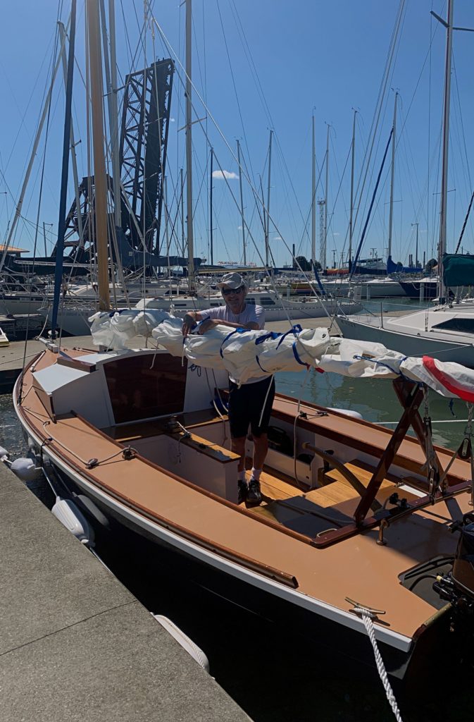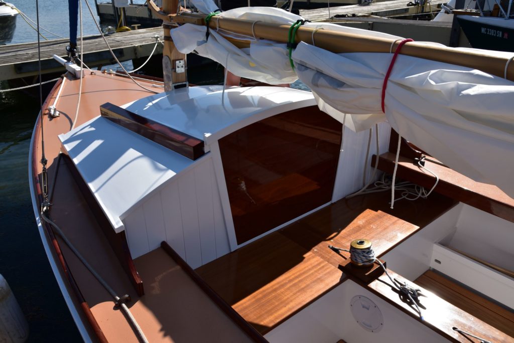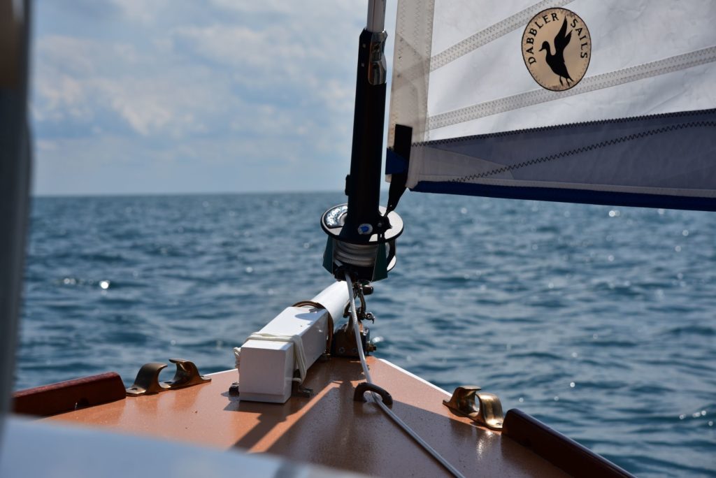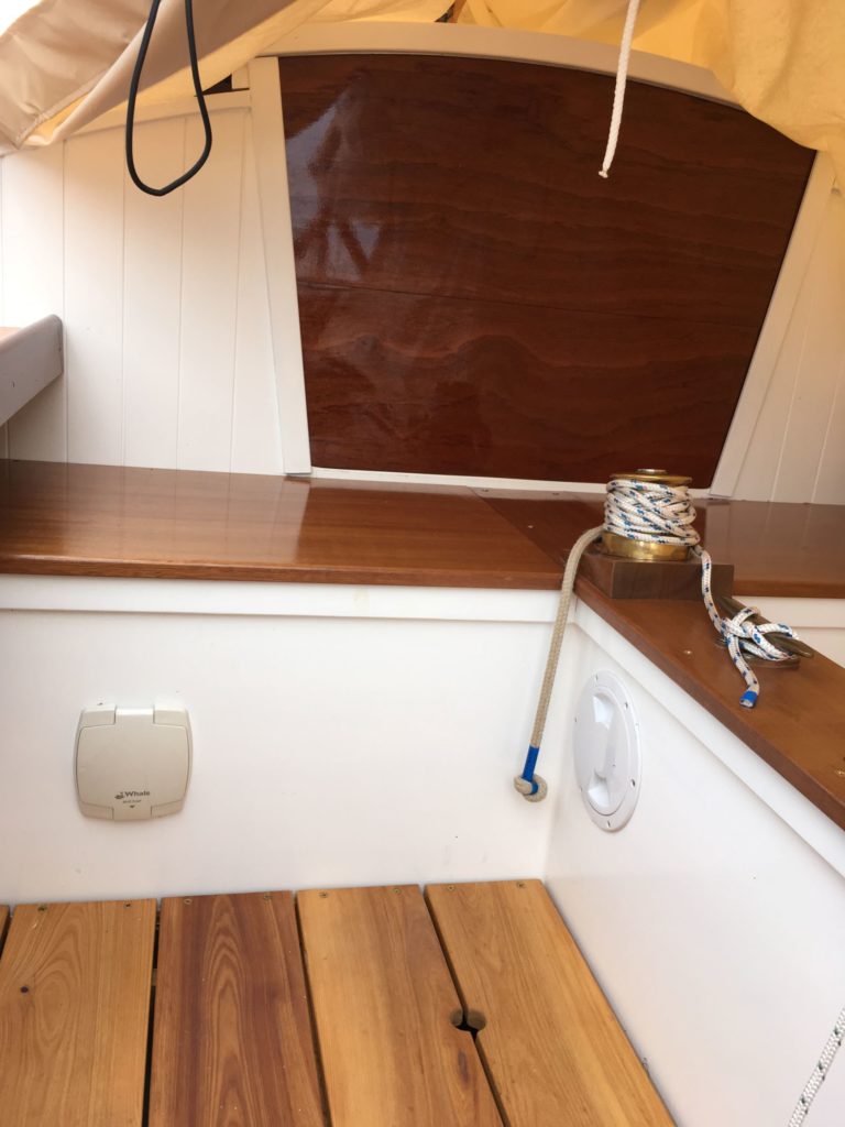 For season three, I built a wooden, removable vertical grab rail at the back of the centerboard case and added a compass there. I also built a more robust boom crutch, taller and positioned to port.