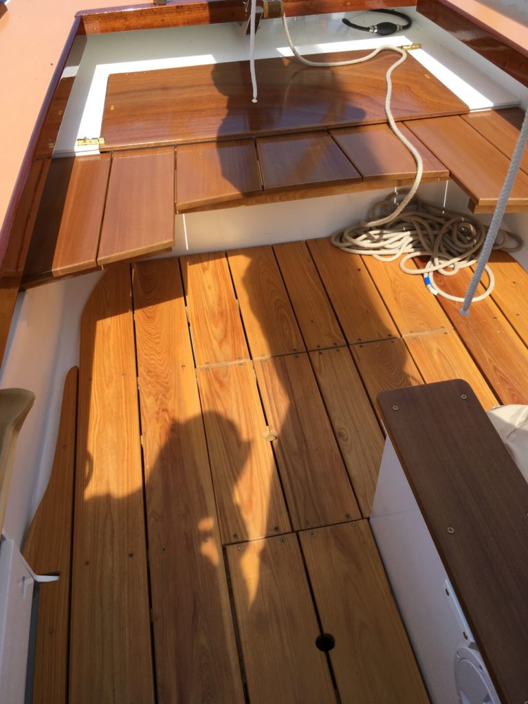 5) Large cockpit for day sailing. It’s comfortable sitting on the side decks with the short coaming height and centerboard case for foot rest. The seats, with custom cushions and back supports, are also quite comfortable.