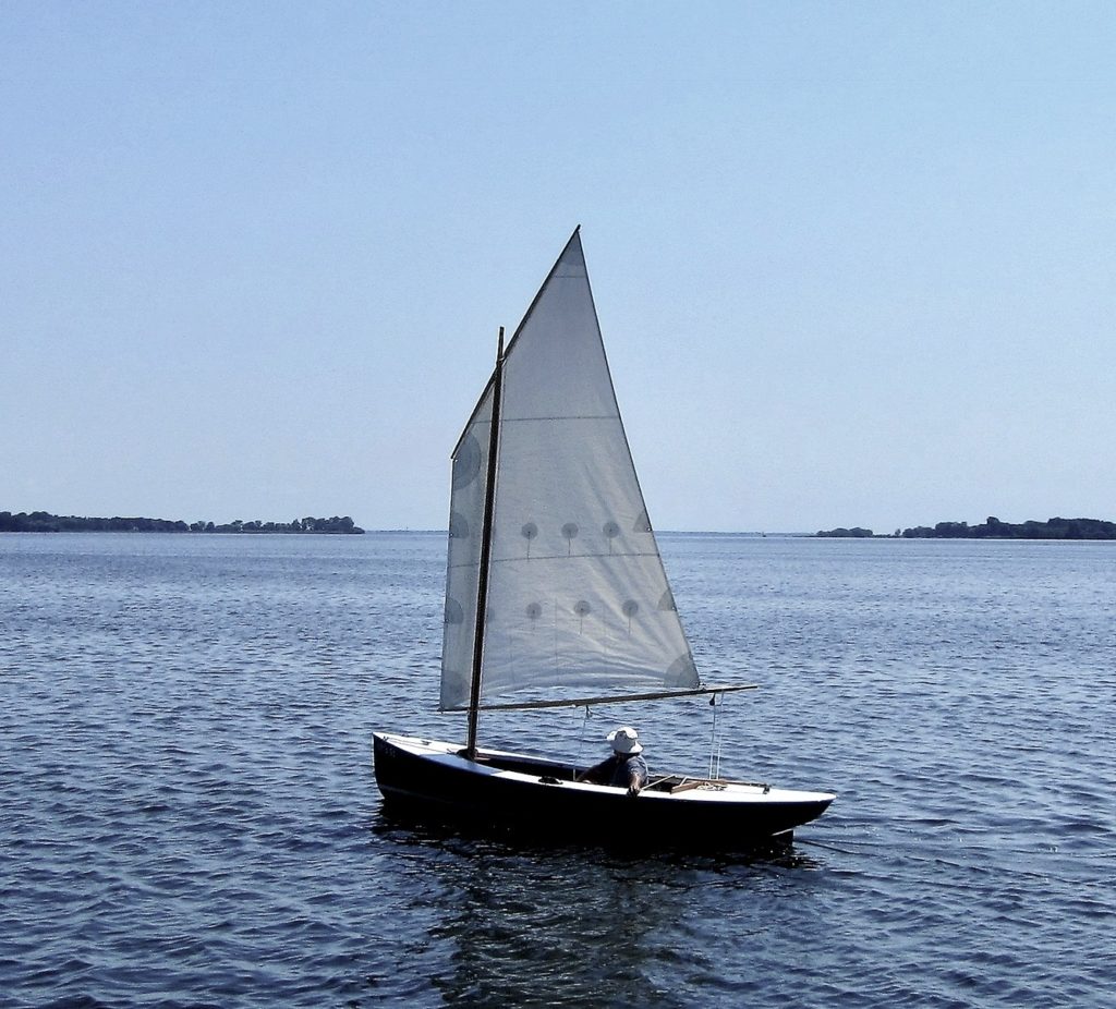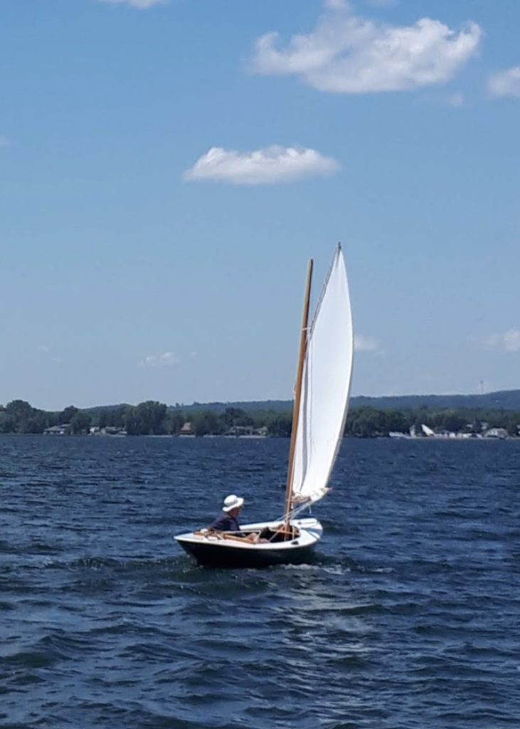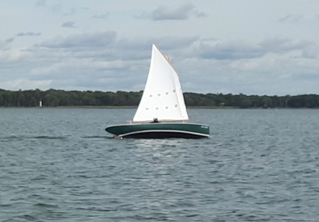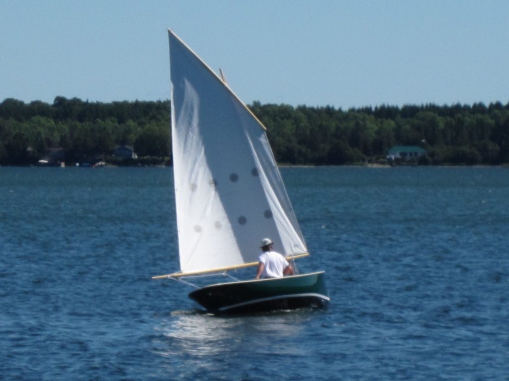 Let’s Go is a 17 foot sailing boat with a balanced lug rig that I designed and built for my own use. I’ve been sailing her since 2011 on Presqu’ile Bay near Brighton Ontario. The hull is of cold molded construction with a daggerboard and a cruiser stern The mast was built using the bird’s mouth method. I built the hull in 1987 as a plug to create an frp mold for a human powered launch. In the early 90s I decided to make her into a sailing boat, but for a variety of reasons, it was not until 2011 that I completed the rig and painted the hull and sailed her for the first time. In 2020 I repainted the hull in dark blue and had a new sail made by the late Stuart Hopkins of Dabbler Sails.