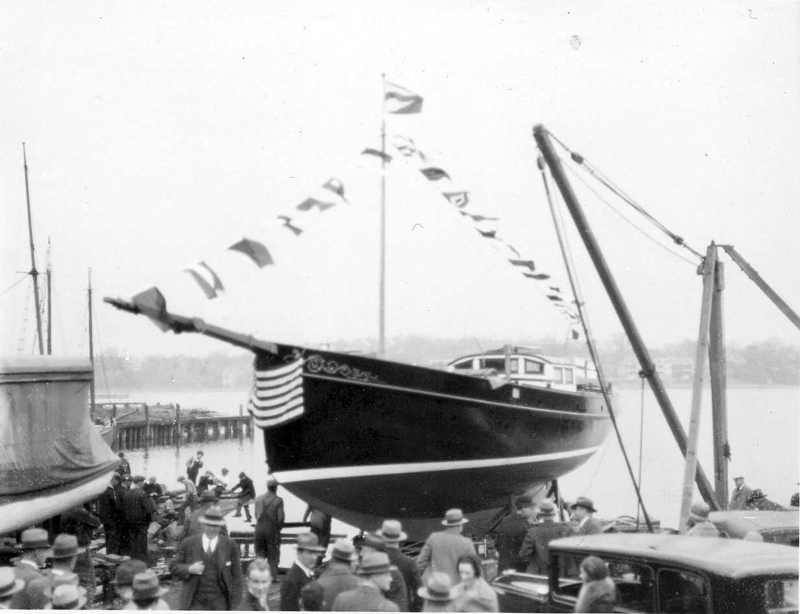 The 1931 Schooner Mahdee was designed by naval architect Samuel Sturgis Crocker (March 29, 1890 – November 24, 1964). and built by G.F Lawson and Son boatyard in Dorchester, Massachusetts, for Alexander White Moffat, known as “Sandy” to friends and “Skipper” to family. He was, at the time of Mahdee’s launch, Commodore of the Cruising Club of America as well as the Boston Yacht Club. Much has been written about Mahdee: several articles by Moffat in Yachting magazine; she is in Roger C Taylor’s book entitled Good Boats, and more recently Bjorn Rudolph Arp’s Great American Schooner Yachts.Moffat described Mahdee’s design and performance in the February 1932 issue of Yachting magazine. His article is titled ‘Mahdee: The First Small Electric Drive Auxillary.’