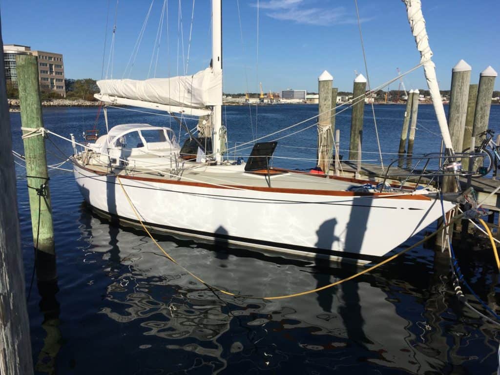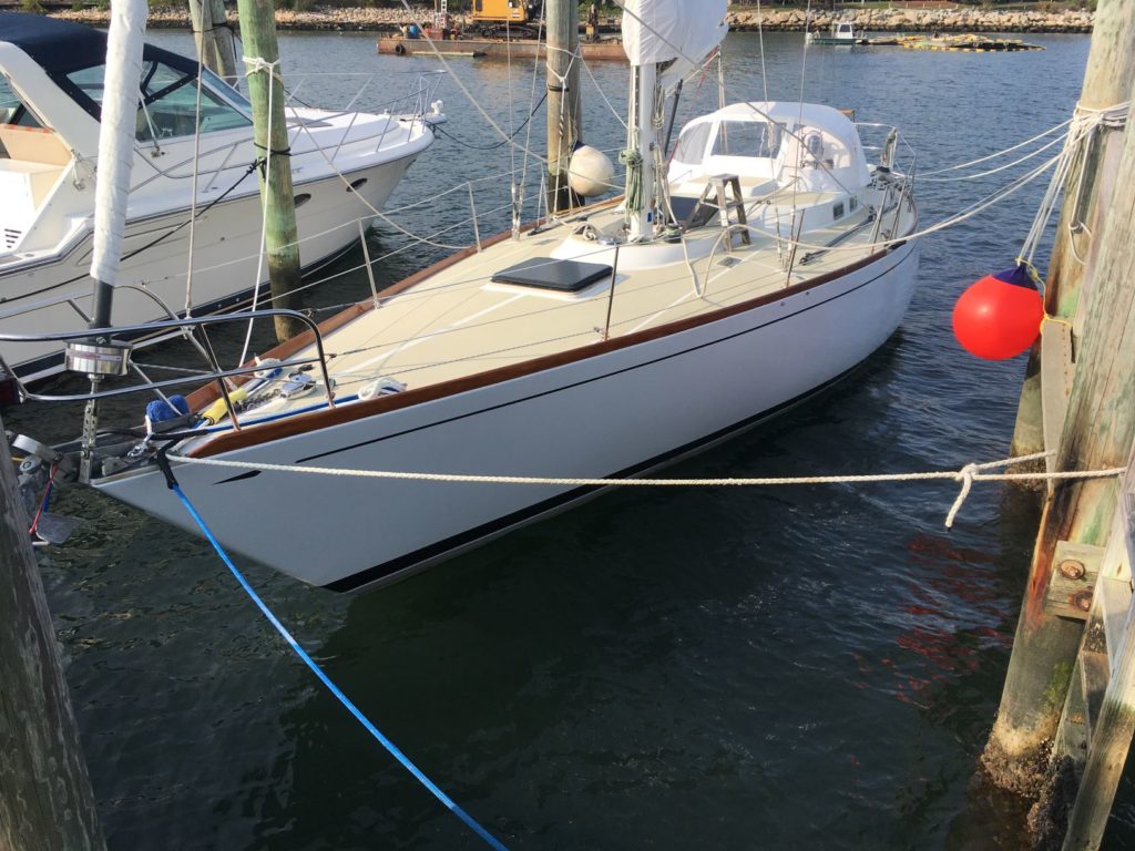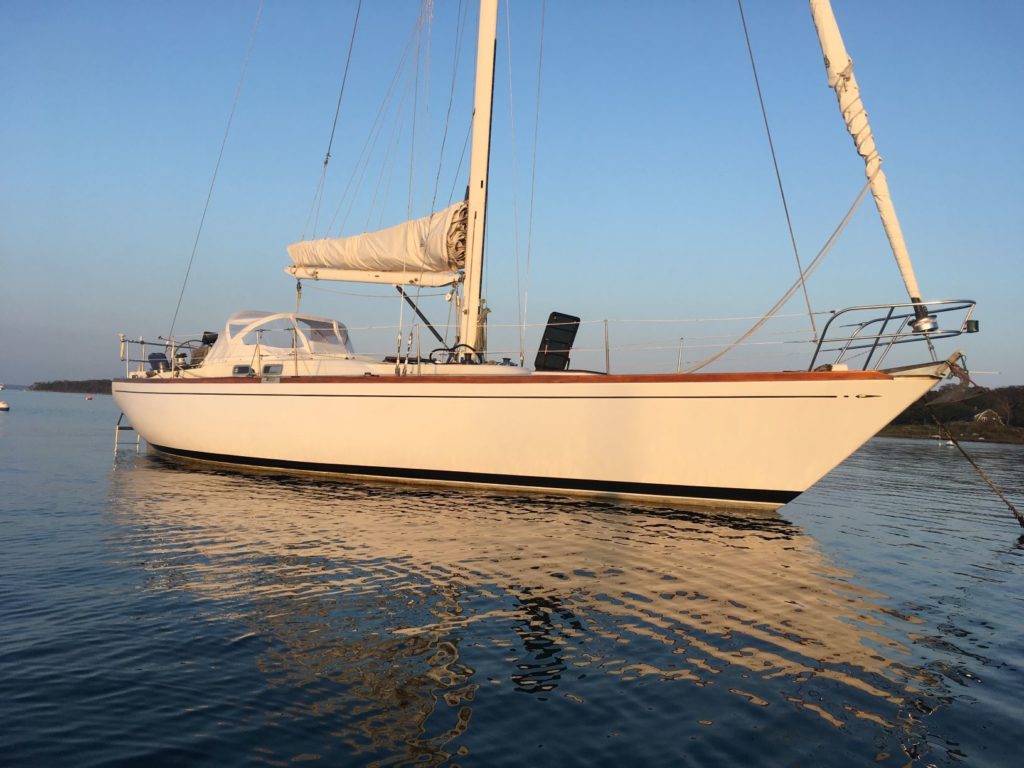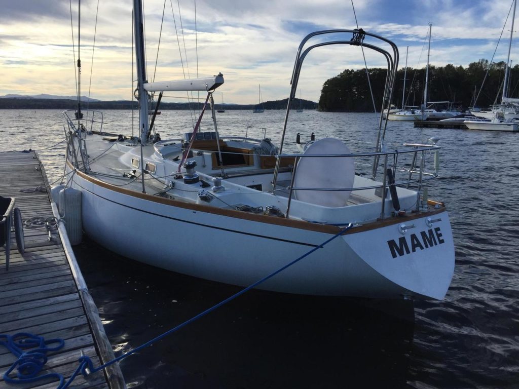 First owned by Steele Griswold – former owner of Shelburne Shipyard – Mame is a heavily modified Tartan-41. The hull and deck were ordered unfinished from Tartan Marine in 1974 and delivered to the Shelburne Shipyard where the interior and teak toe rail were installed to Mr. Griswold’s specifications.The Tartan 41 was designed by Sparkman & Stephens (S&S) at the request of Charlie Britton, founder of Tartan Marine, Co., who was eager to produce a boat that could compete with the new S&S designed Swans. Essentially Charlie was given a Swan minus the teak deck and fancy joinery work and as a result, the Tartan 41 became lovingly known as “the poor man’s Swan”.