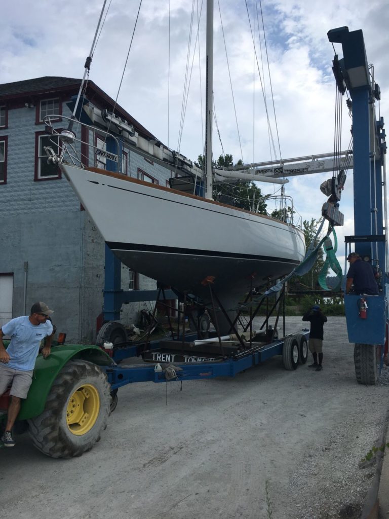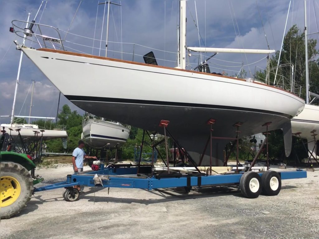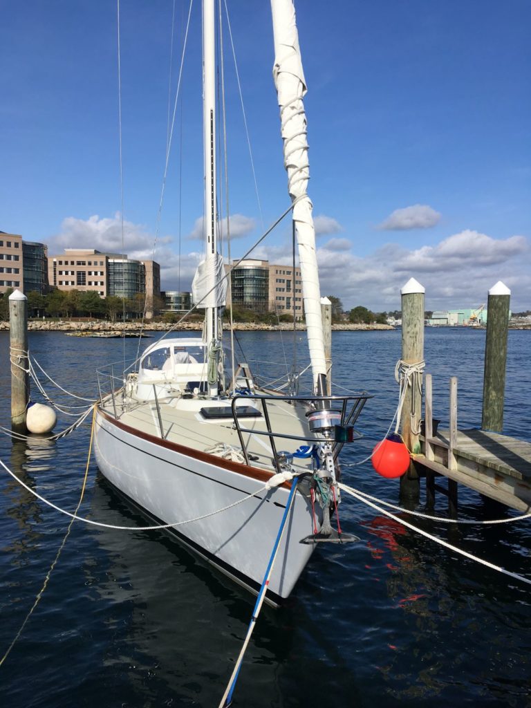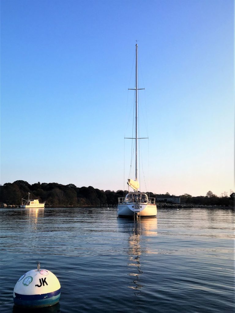 First owned by Steele Griswold – former owner of Shelburne Shipyard – Mame is a heavily modified Tartan-41. The hull and deck were ordered unfinished from Tartan Marine in 1974 and delivered to the Shelburne Shipyard where the interior and teak toe rail were installed to Mr. Griswold’s specifications.The Tartan 41 was designed by Sparkman & Stephens (S&S) at the request of Charlie Britton, founder of Tartan Marine, Co., who was eager to produce a boat that could compete with the new S&S designed Swans. Essentially Charlie was given a Swan minus the teak deck and fancy joinery work and as a result, the Tartan 41 became lovingly known as “the poor man’s Swan”.