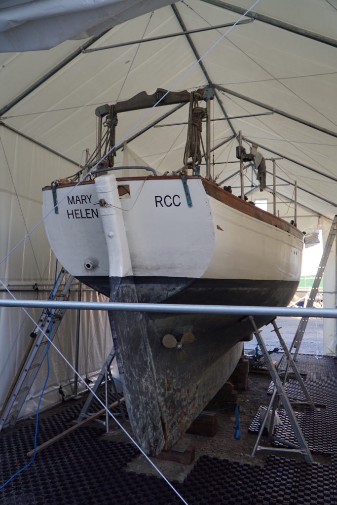 My daughter and I acquired “Mary Helen” in July 2022 and sailed her from Creran Marine near Oban in Scotland, back via the Irish Sea and coastline, to our home base in Cornwall. She’s currently out of the water and weathering the winter Atlantic winter storms that are sweeping full force across the surrounding farmland of the boatyard. Our temporary boat shelter is being battered and rocked as we begin to work on the first project of replacing her decks. At least we are dry and can make progress with the gales reminding us of the need for repairs to be strong. There will come a time when we are thinking of each fastening and plank and praying they hold. By the time she is back in the water later this year our hands will have been on everything. Each knee, butt, bolt, plank, beam and fitting will have been discussed in detail. “Do it now or can it be later?”