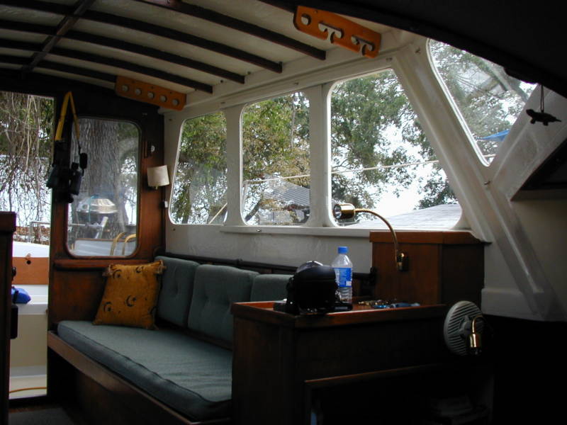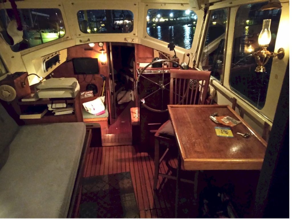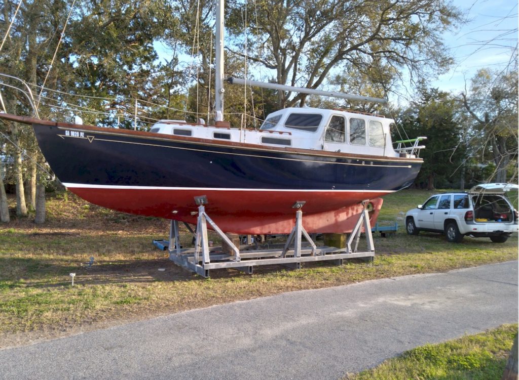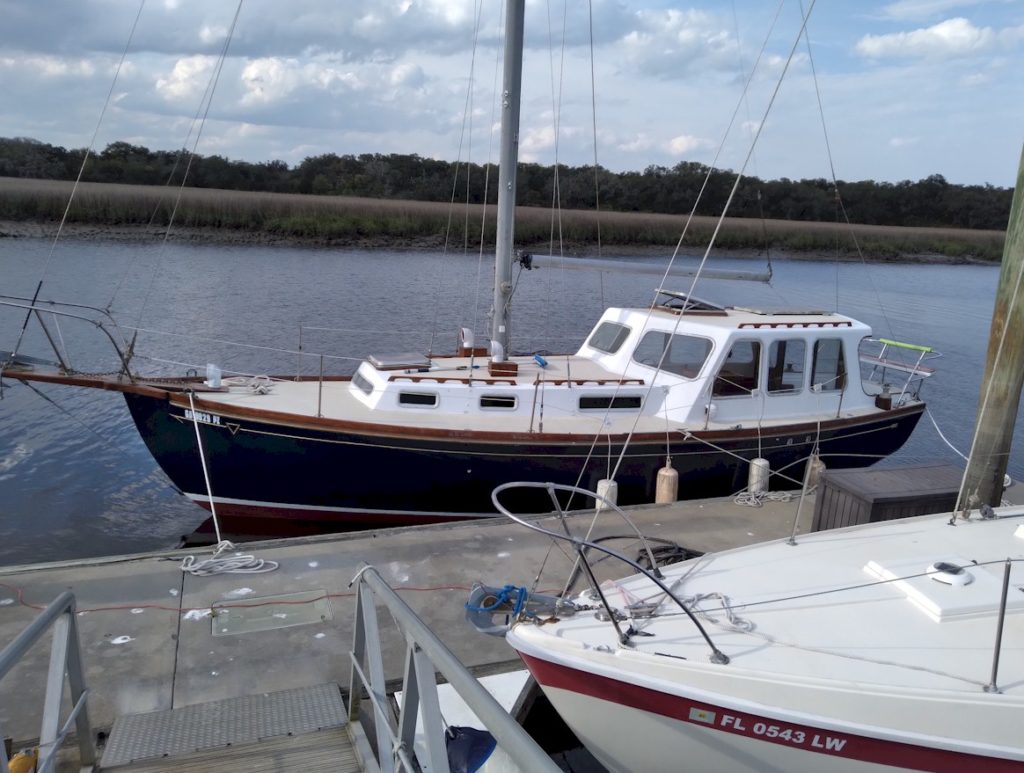 1964 Triangle Marine motorsailer. Triangle Marine was started by Charlie Angle a sailor who raced out of the Rochester NY Yacht Club. He designed a number of boats but this boat is built on the hull of his center cockpit, centerboard boat. Very unusual for the time. Charlie was a sailor and we see the FINISTERRE (S&S) design had an influence. Also I note the Tartan 27 hull to be very similar. This boat is a motorsailer version of the center cockpit boat. It does not have a centerboard. Currently it has a Perkins 4-108 engine. Our guess is it originally had a grey gas engine. Triangle marine operated from maybe 1960-1969? The hulls were made by Grampian marine in Canada to specifications then shipped to Rochester to be finished out. In later years some boats were sold under the US yacht name. The hull is solid fiberglass, Decks are fiberglass with 3/4 plywood core. The toe rail is teak, interior is teak laminated ply or mahogany laminated ply. No fiberglass pan. Everything is accessible. Pilothouse is plywood with fiberglass cloth over. Inside steering only.