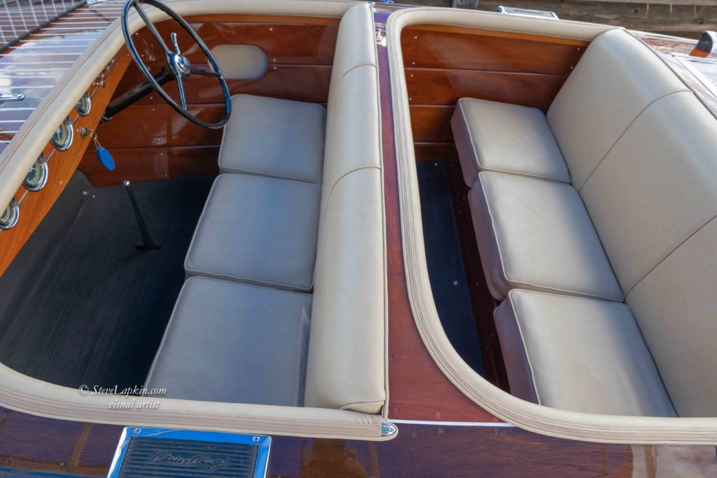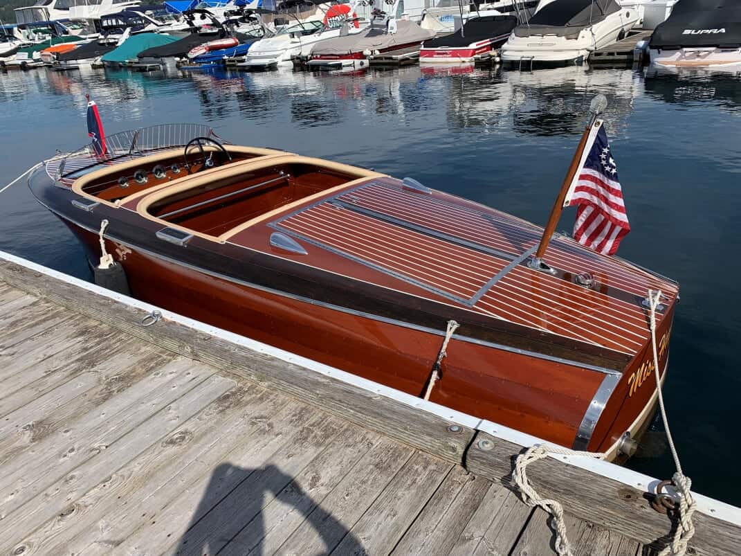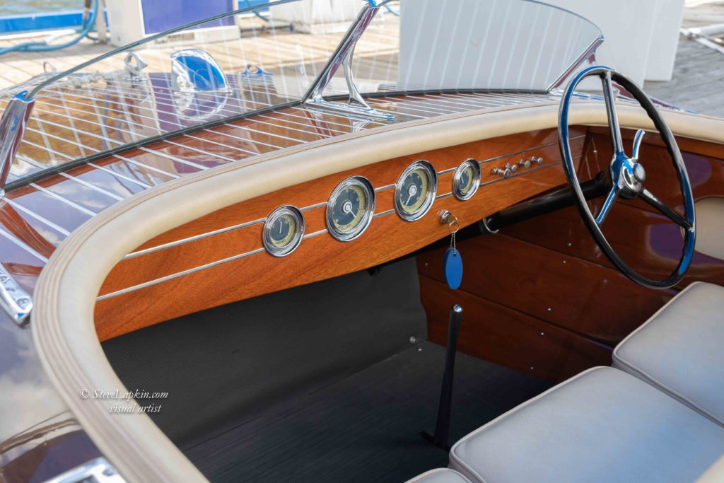 My goal was to restore her to an original appearance. The initial refinishing to the boat was performed by Mike Kerfoot with the aid of his son Andy. A search for a period correct engine led me to Sid Young who provided a Chris Craft KFL engine that was in need of rebuilding. The Resort Boat shop rebuilt and installed the engine and addressed many issues. The interior was replaced with correct beige vinyl. I did not initially appreciate the complexity of refitting everything to original condition. As I have learned everything takes twice as long and costs twice as much as your budget! In 2014, the finish was failing and the interior upholstery needed to be replaced again. I asked Andy Kerfoot to restore the boat to its original appearance. Andy stripped the boat, refinished inside and out and replaced the instruments with restored gauges. New upholstery was placed. The restoration of the boat was similar to a frame off restoration of a classic car.