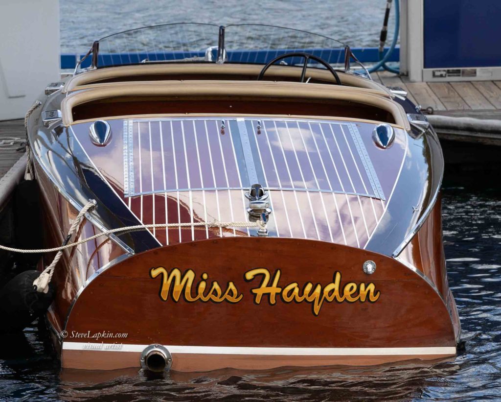 I began searching for a retirement home in the 1990s. In 2001, I purchased my home on Hayden Lake just north of Coeur d’Alene, Idaho. There were 30 woodies on the lake! The Coeur d’Alene wooden boat show further stimulated my interest and I began my search for a boat of my own. I finally found Miss Hayden, a 1940 Chris Craft,17-foot runabout, in 2003 and began the long restoration process. I looked at many beautiful wooden boats prior to selecting the Barrell back. I thought the double curve of the transom exemplified the art of wood boat construction and represented a time of unparalleled craftmanship. She also represented a time when life was less complicated and more refined just prior to the second world war.
