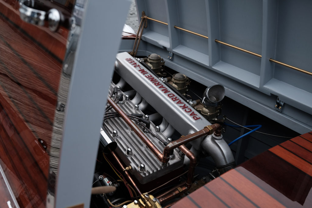 Gar Wood Speedster (original & certified by Gar Wood Society – previously shown on Gar Wood’s 1936 Chicago Boat Fair stand, then upgraded at the Marysvill plant and shipped via Gar Wood’s French and Swiss distributors to Persia in 1936 to the Shah of Persia; featuring its seldom Packard Racing engine, which replaced the original Gray Marine in 1947)